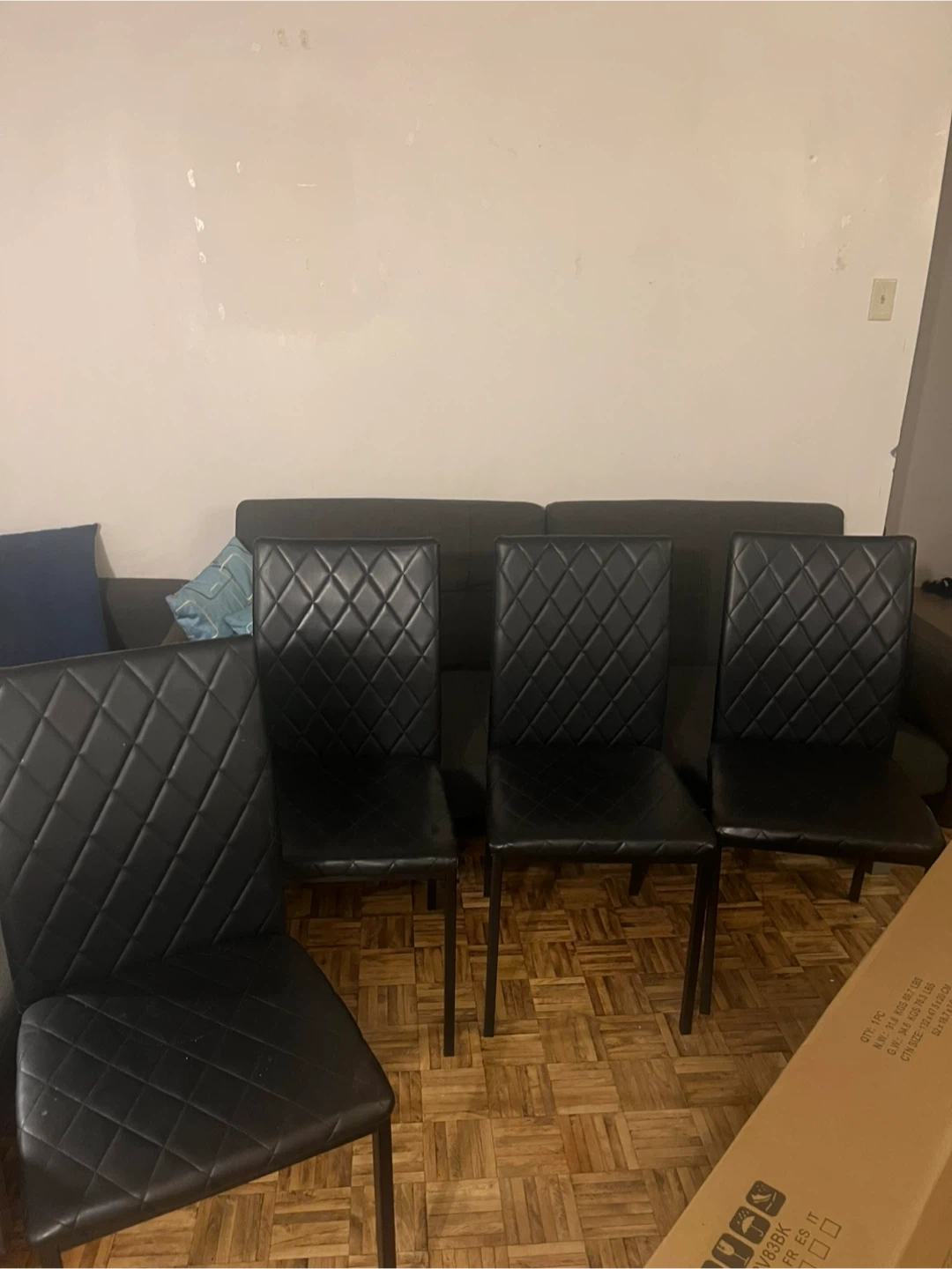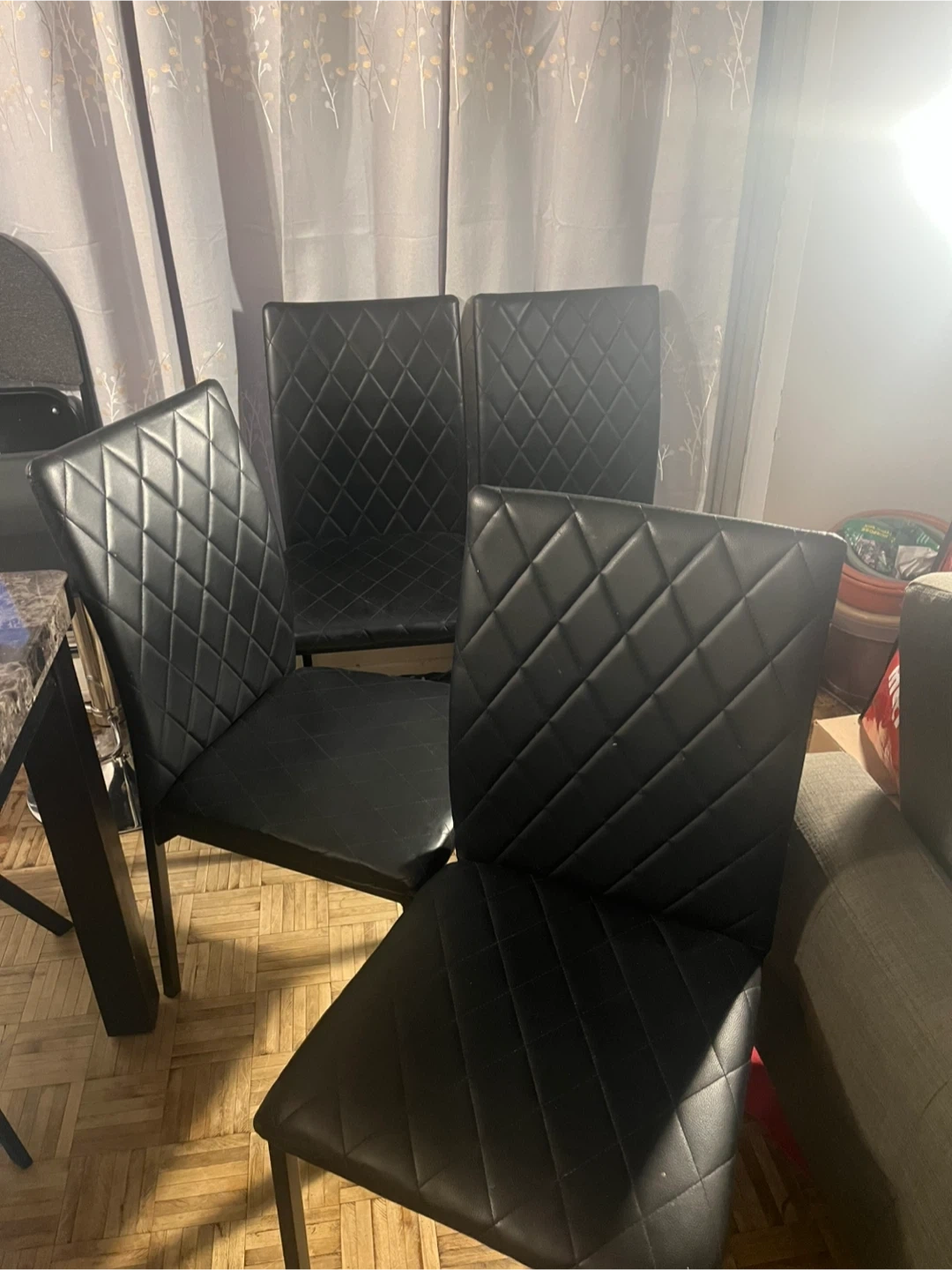 Selling a set of four dining chairs! They feature a sleek black finish with a stylish diamond pattern on the backrest and seat. These chairs would add a touch of modern elegance to any dining space. They are in great condition and ready to be enjoyed in your home