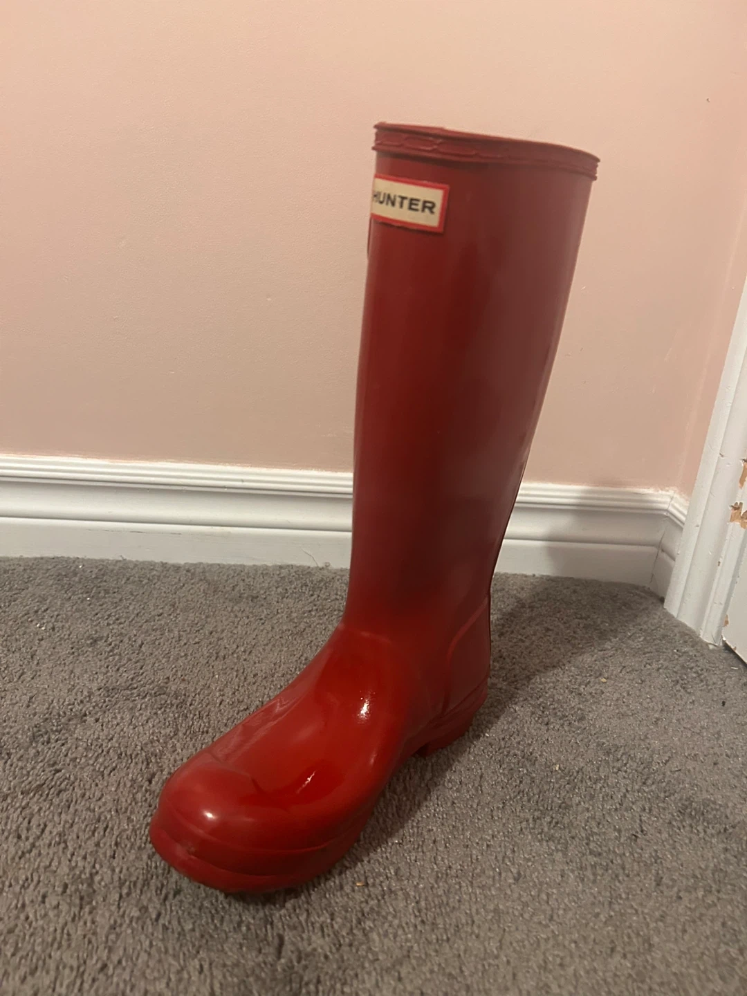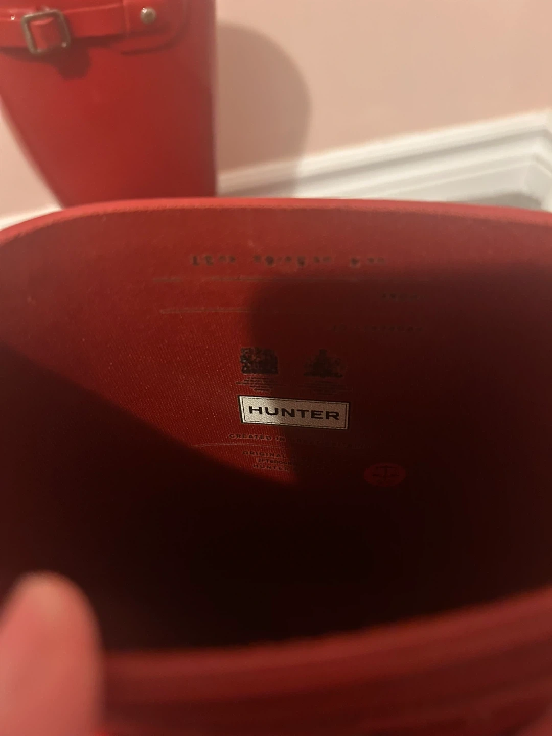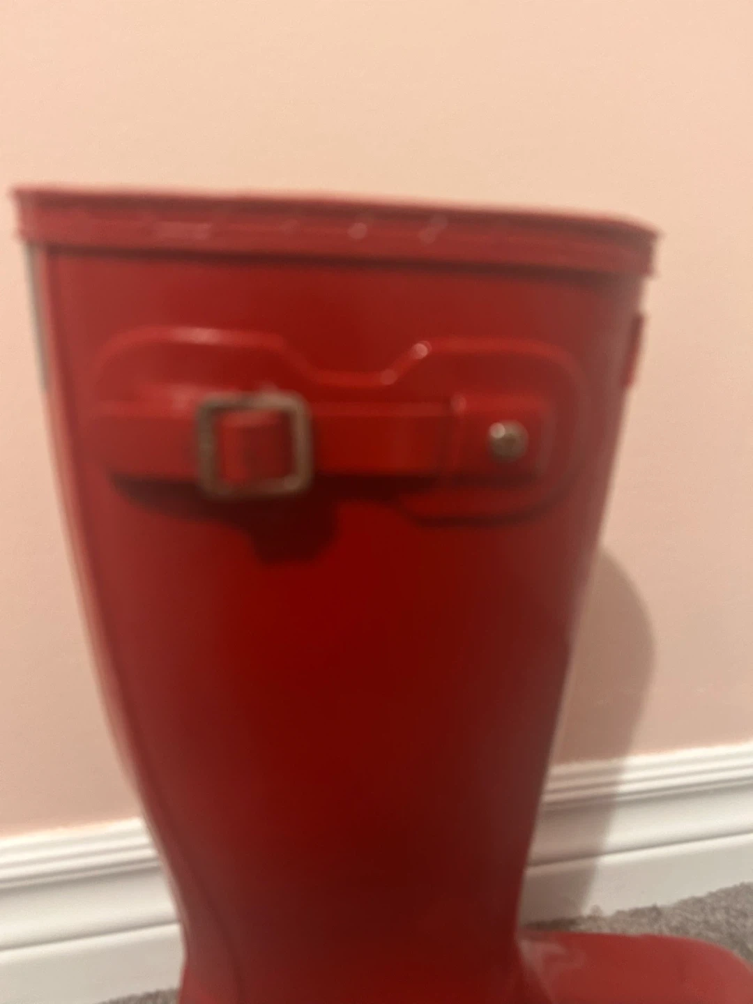 Classic red Hunter rain boots. Tall style with adjustable buckle strap. Rubber construction for waterproof wear. Perfect for rainy days!