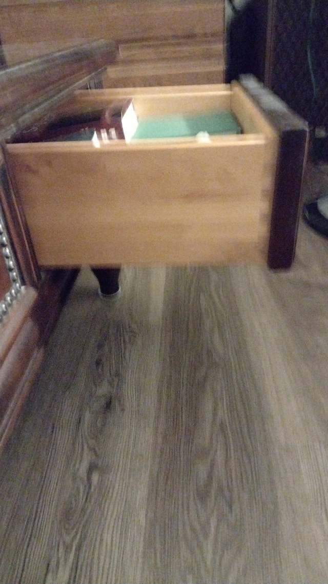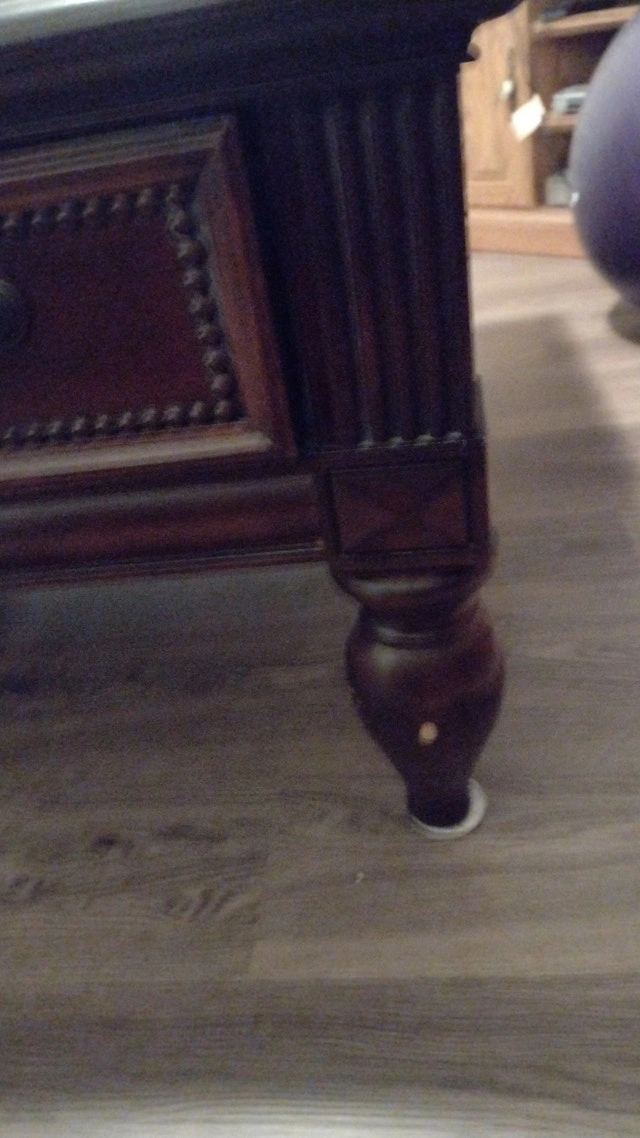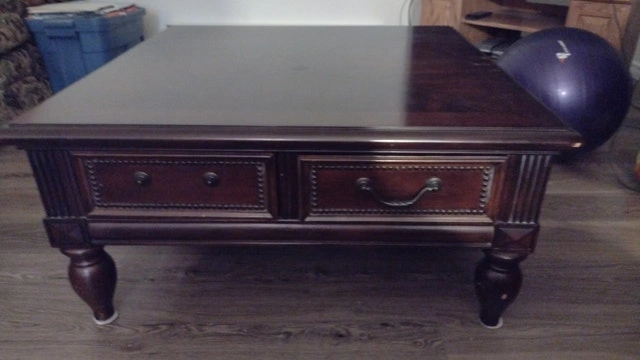 Making room for exercise area. Table size is 40"x 40" x 19" high. Picture shows missing handle on one drawer. Dovetail drawers. Used - Good condition. Cashless payment and cash accepted. For sale by owner. Curbside pickup available.