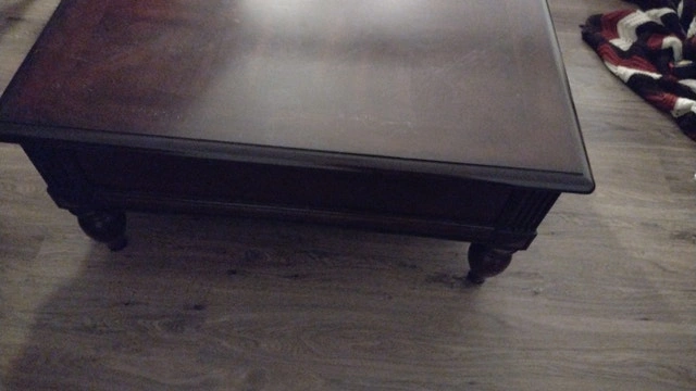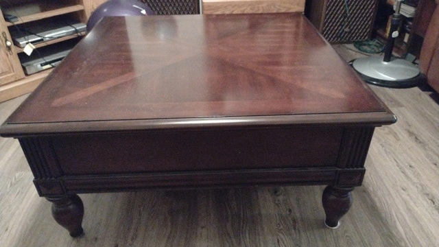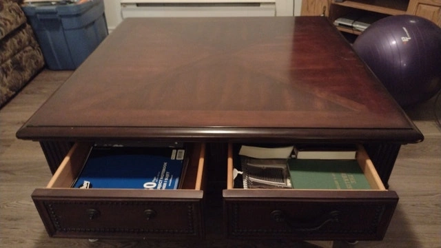 Making room for exercise area. Table size is 40"x 40" x 19" high. Picture shows missing handle on one drawer. Dovetail drawers. Used - Good condition. Cashless payment and cash accepted. For sale by owner. Curbside pickup available.