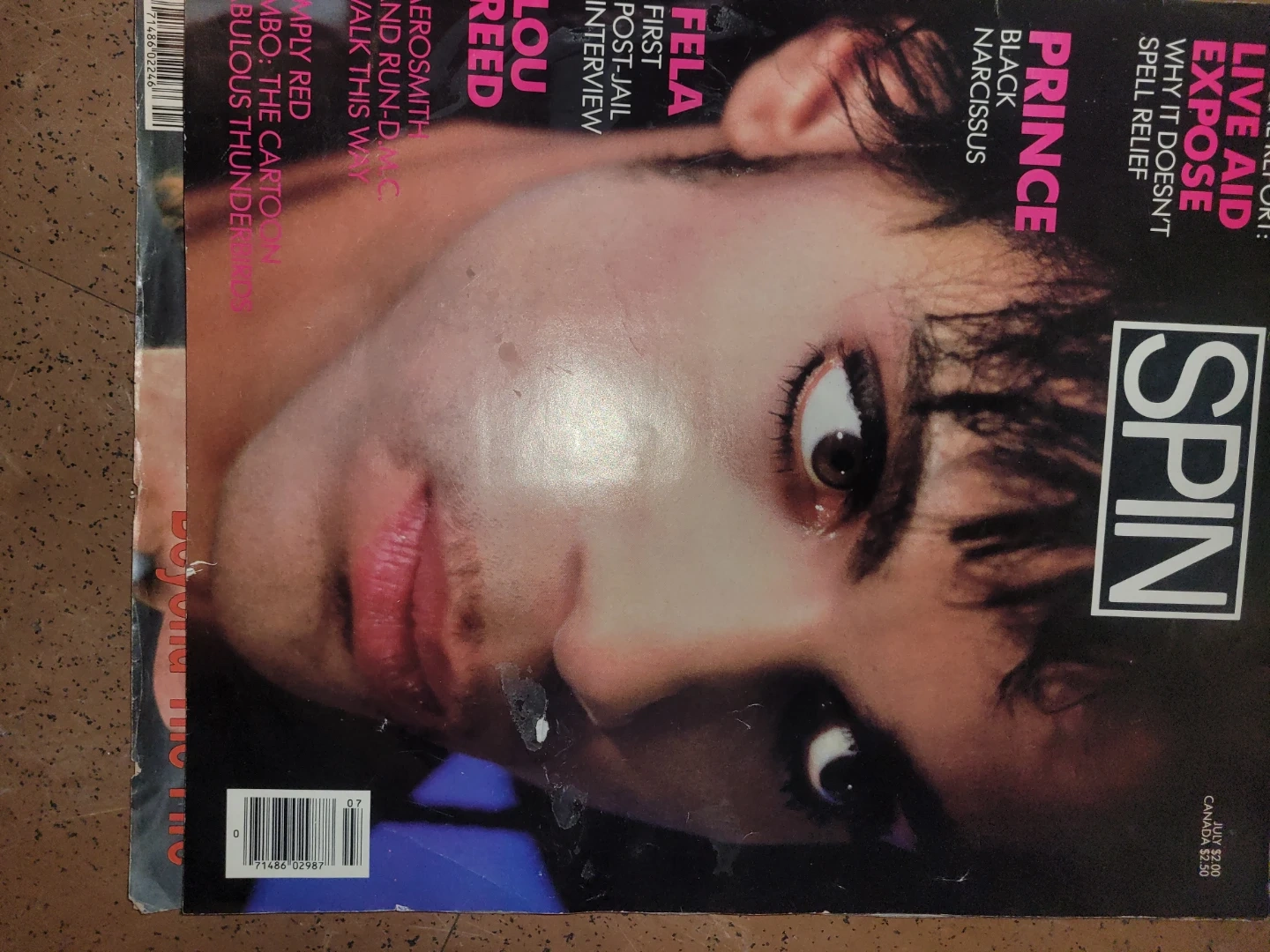 Spin Magazine from July 1985 featuring Prince on the cover. This issue includes an article on Live Aid and other interviews. The magazine is in good condition for its age.