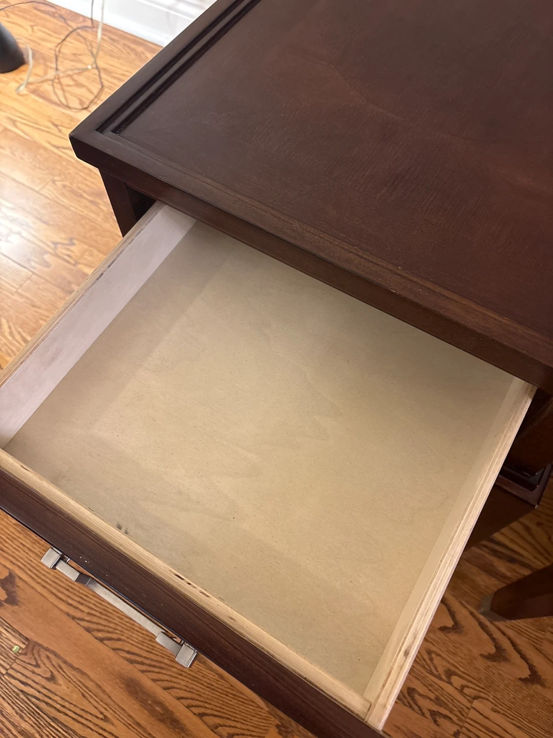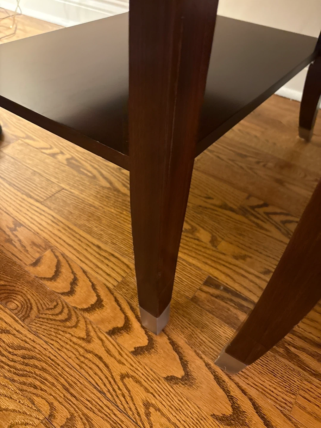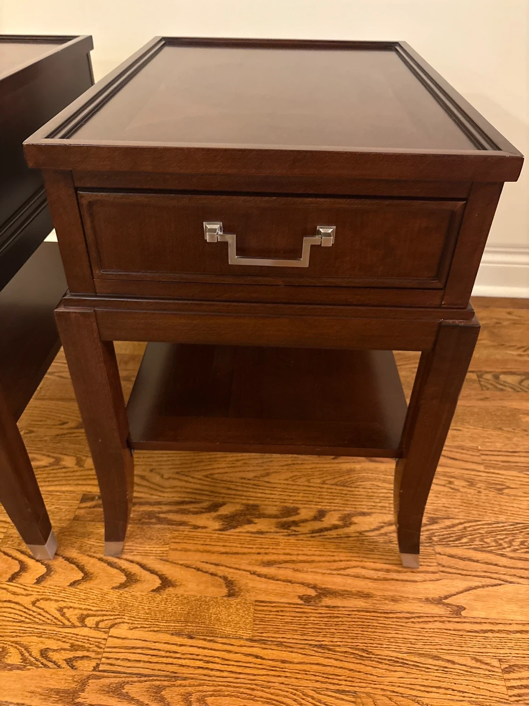 Selling a set of two dark brown wood end tables. Each table has one drawer with a silver pull and a lower shelf. Wood construction. Great for living rooms or bedrooms!