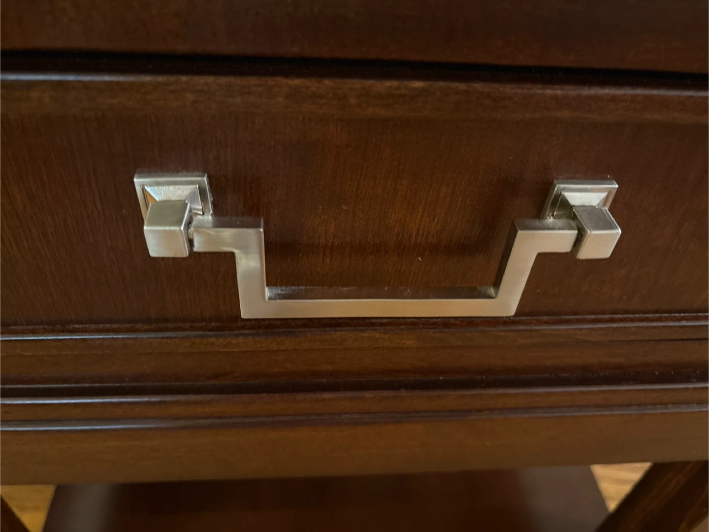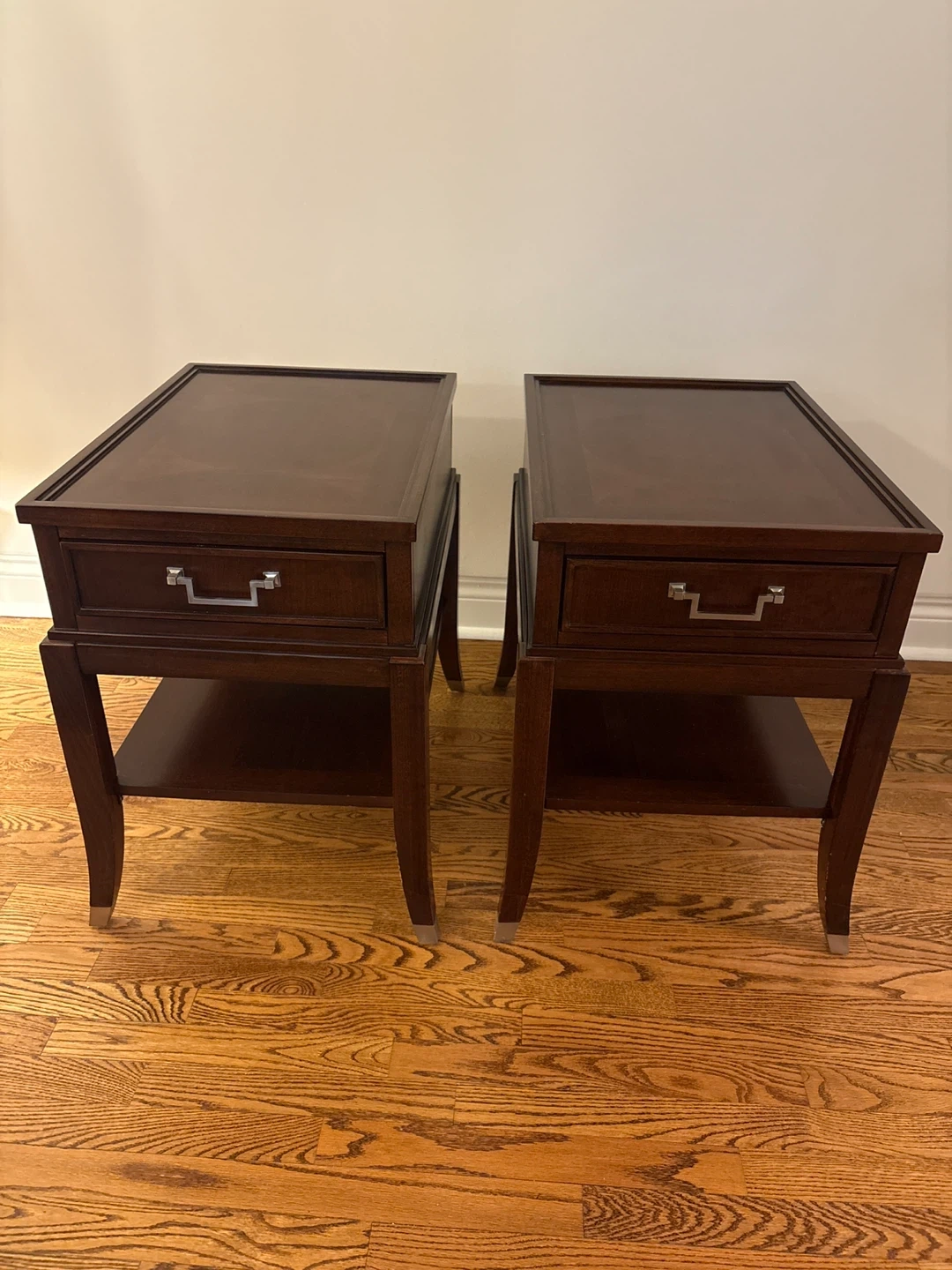 Selling a set of two dark brown wood end tables. Each table has one drawer with a silver pull and a lower shelf. Wood construction. Great for living rooms or bedrooms!