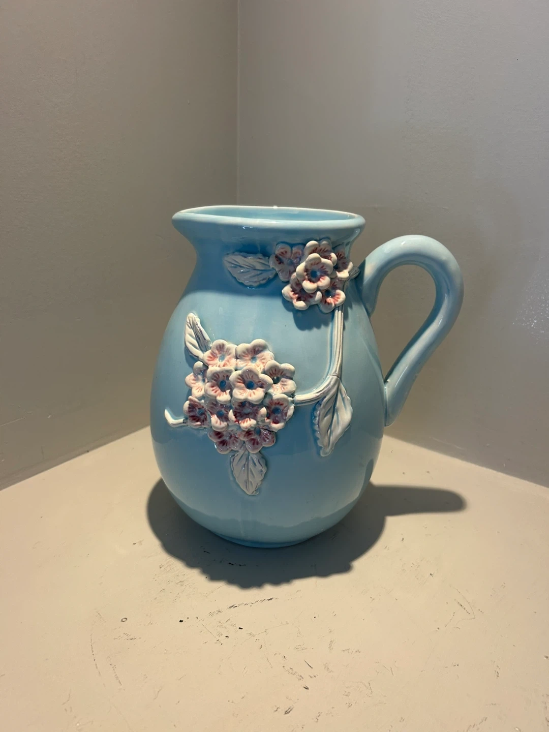 Vintage Czechoslovakian pottery pitcher marked "Hydrangea - Made in Czecho." Beautiful raised floral design in pastel blue. Great as a vase or display piece. No cracks or repairs.