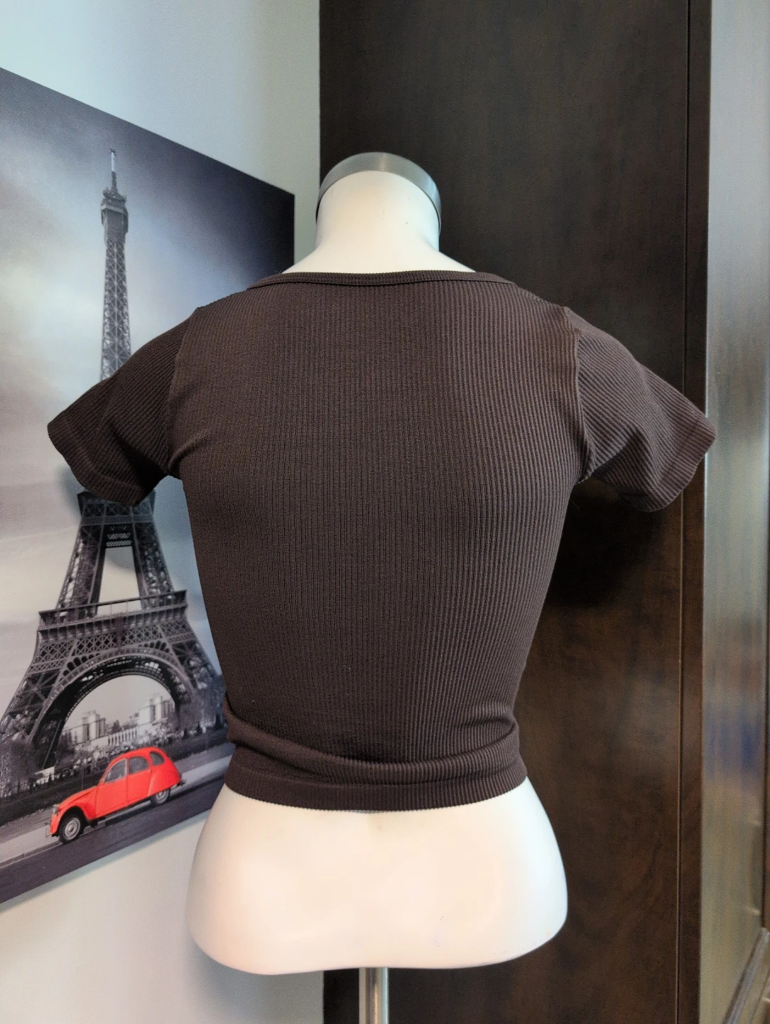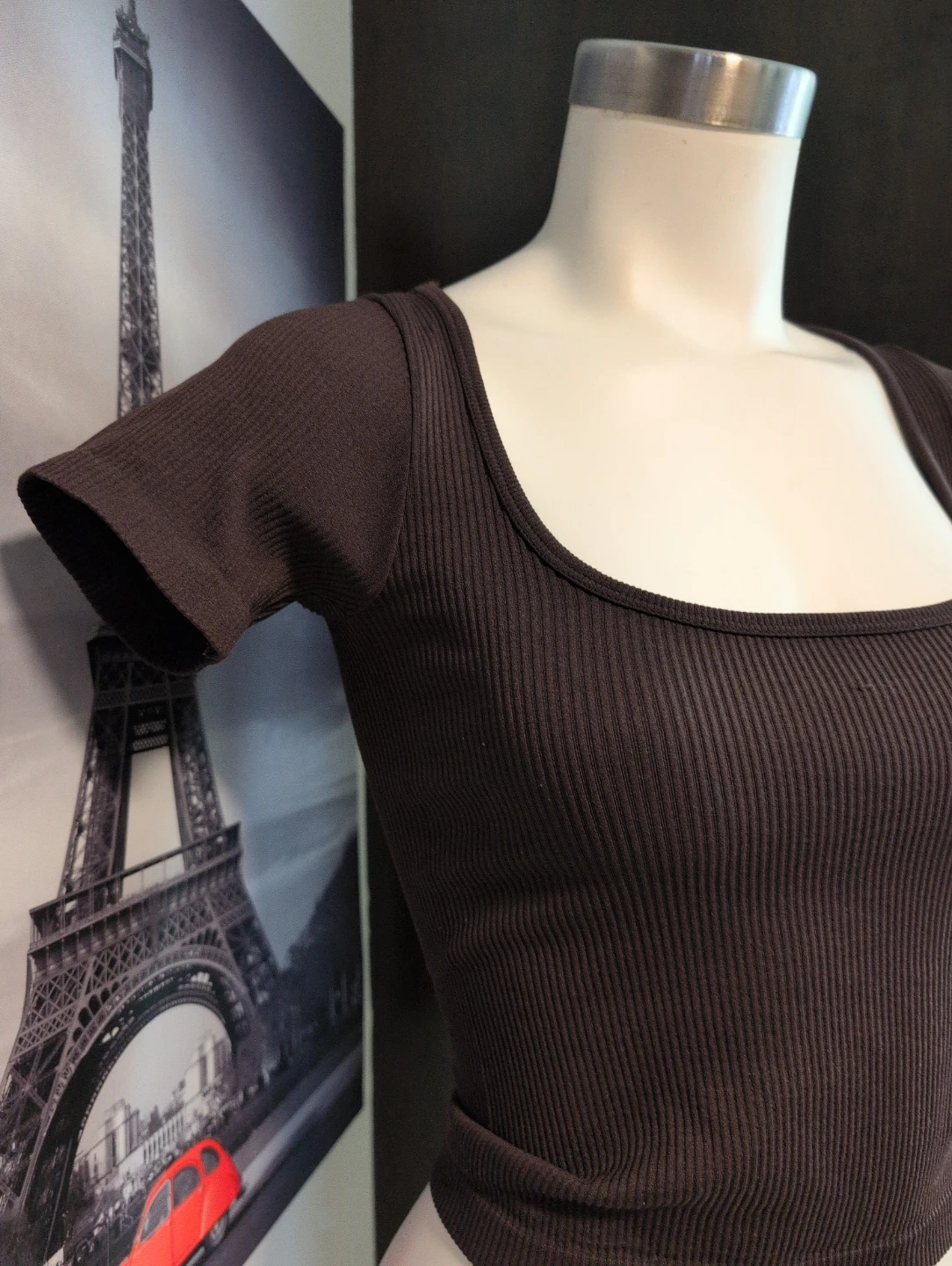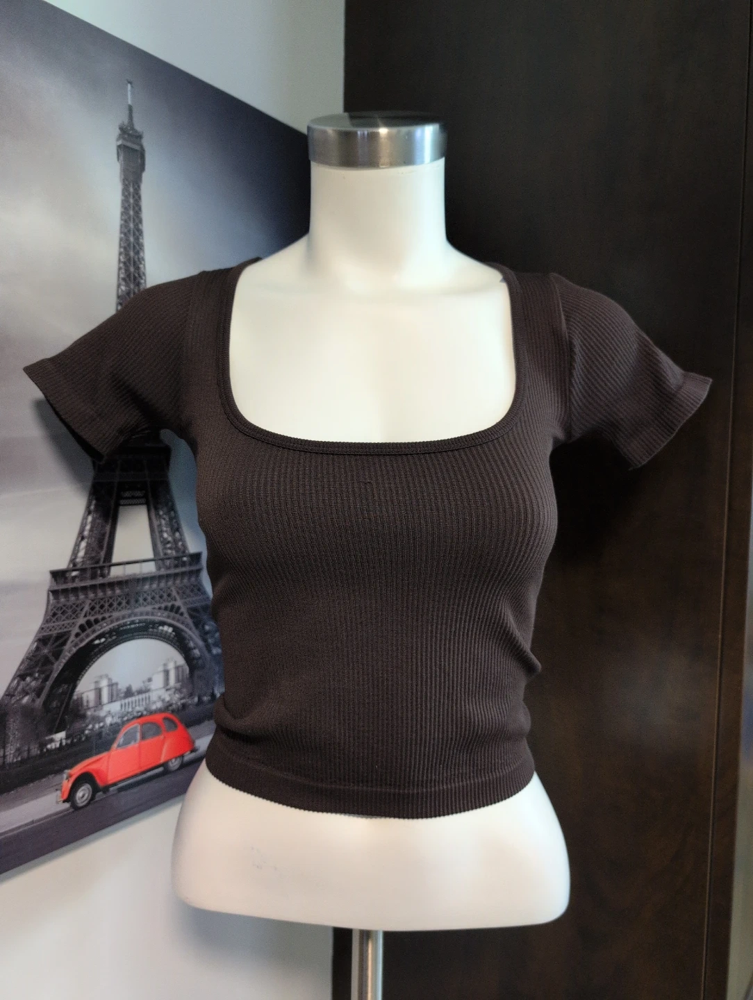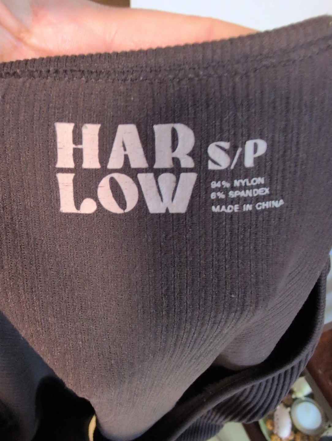 This HAR LOW ribbed top has short sleeves and a scoop neck. Made from 94% nylon and 6% spandex for a comfortable stretch. It's a size S/P and manufactured in China. This top is great for layering or wearing on its own!