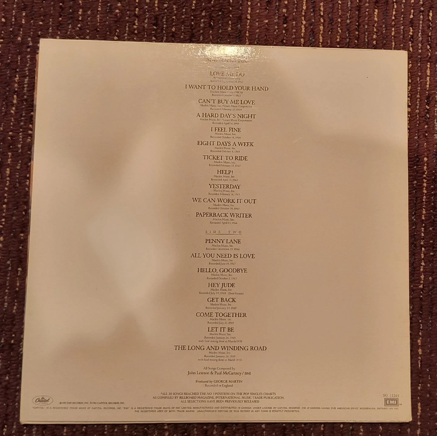 Selling a copy of The Beatles' Greatest Hits on vinyl record! It includes all their top hits like 'Love Me Do', 'I Want to Hold Your Hand', 'Can't Buy Me Love', and many more. A must-have for any Beatles fan! from audiophile collection.