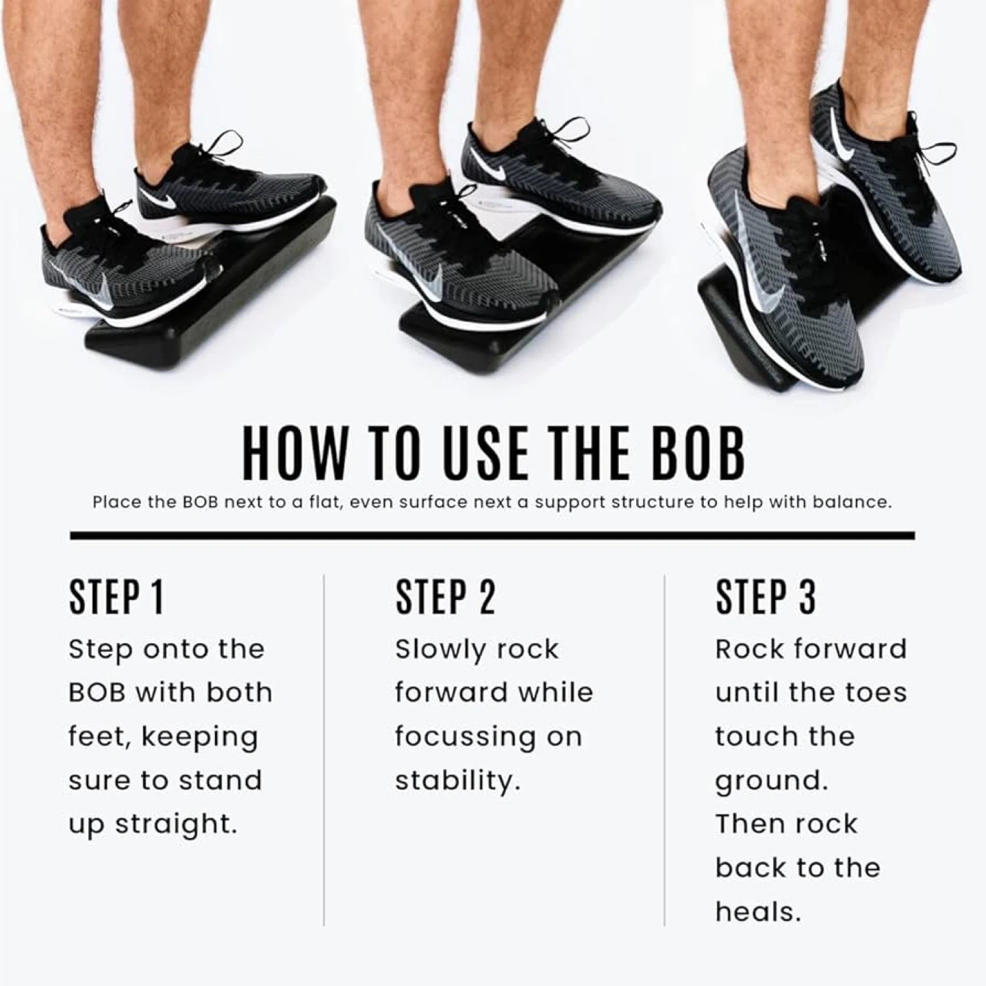 94The BOB - the incredible calf master system Balance / Flexibility / Strength: You will be able to stretch your Achilles, tibialis, and gastrocnemius muscles to places they have never been before. Fast Results: The results are incredible in less than 3 minutes a day. Bobbing: Gently rock your toes forward, then rock back to your heels, repeating the BOBBING motion from heel to toe. In excellent condition