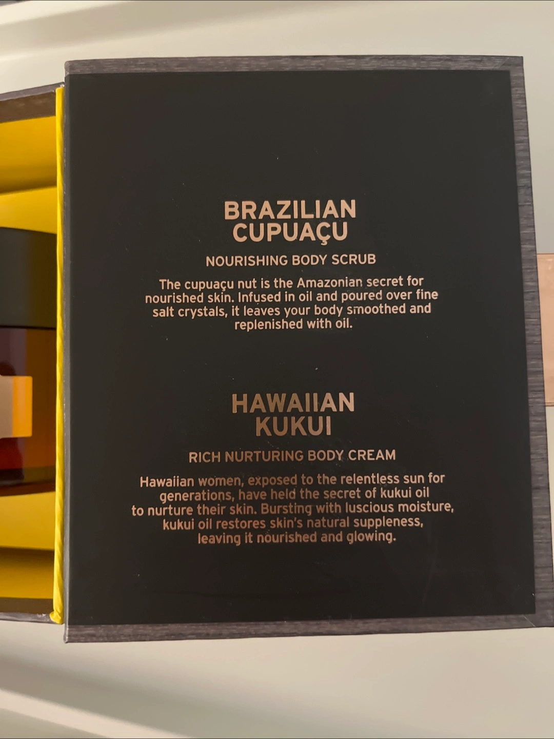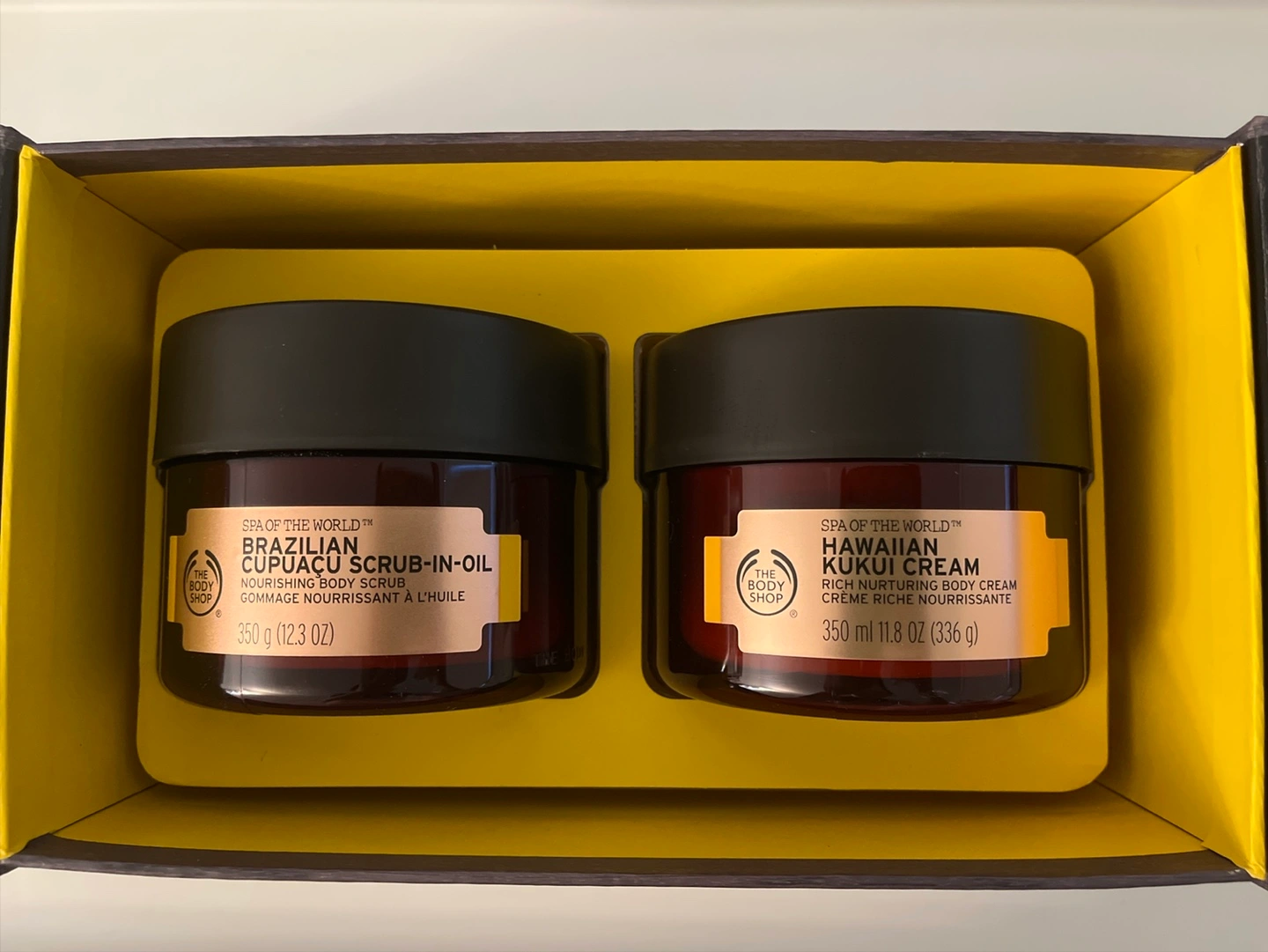 Selling a set from The Body Shop's Spa of the World collection! This Blissful Ritual set includes: - Brazilian Cupuaçu Nourishing Body Scrub (350 g / 12.3 oz) - Hawaiian Kukui Rich Nurturing Body Cream (350 ml / 11.8 oz / 336 g) It's a lovely set to infuse your skin with fine, naturally inspired ingredients, and delicate fragrances for a sensory journey