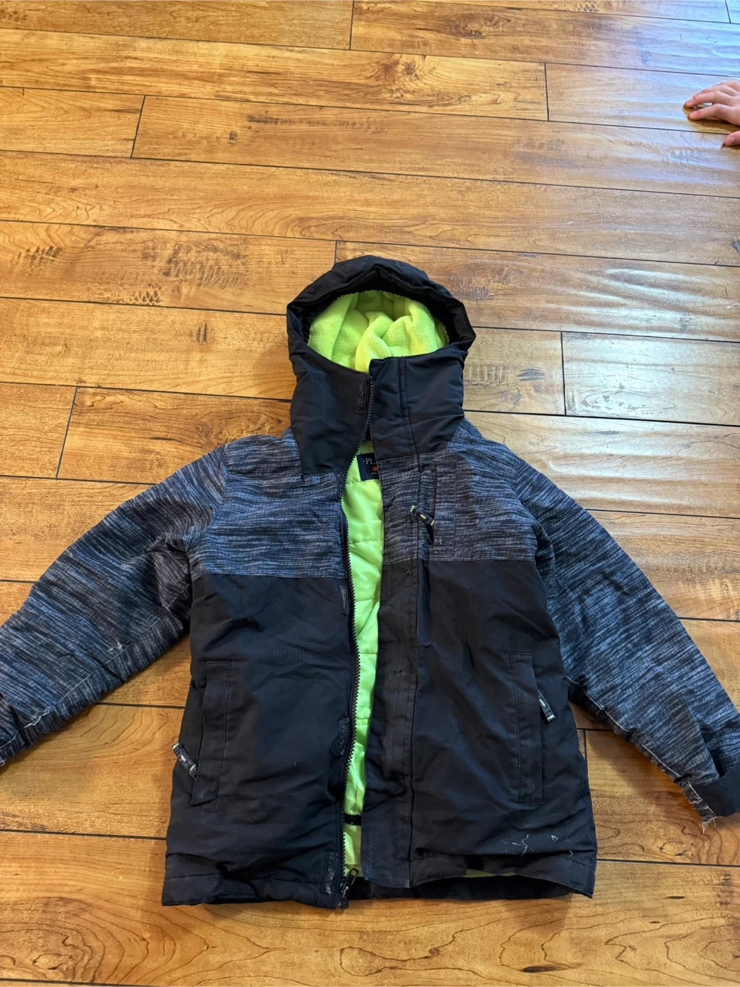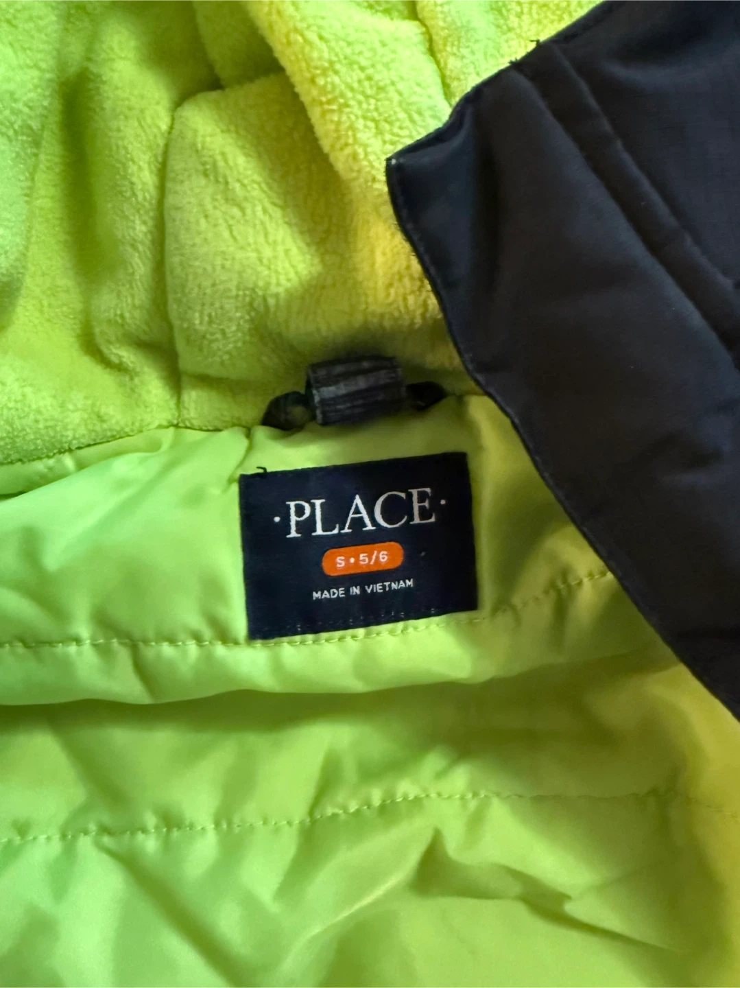 Selling a The Children's Place jacket in size S (5/6). It's in good condition and perfect for keeping your little one warm! The jacket features a stylish design with a black and grey exterior and a bright neon green interior lining