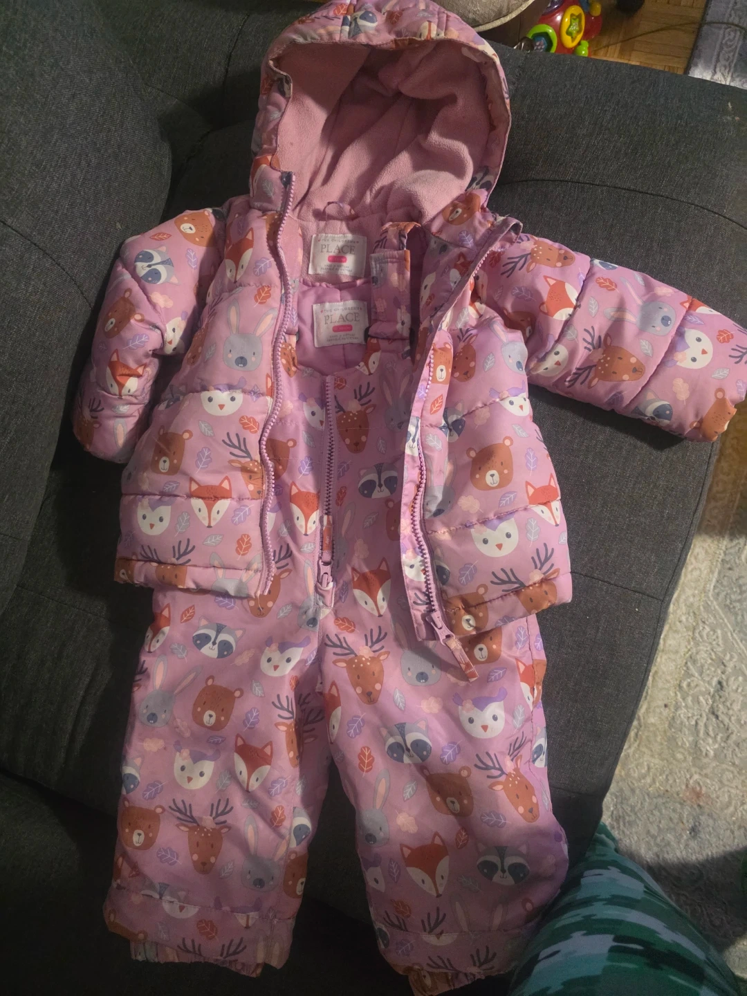 286A cute and cozy snowsuit from The Children's Place! It features a fun animal print in shades of pink and purple. Perfect for keeping your little one warm during the winter months. Size is 12-18 months