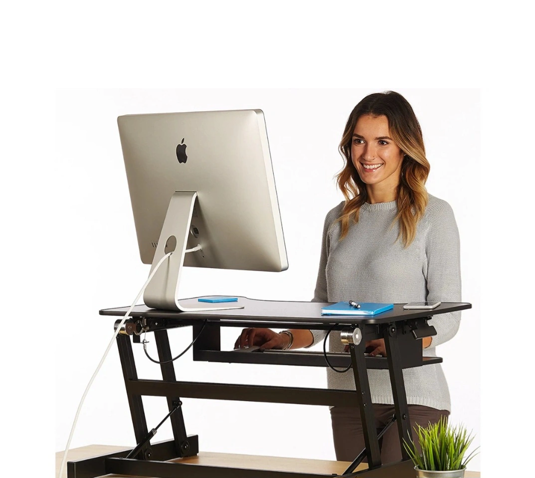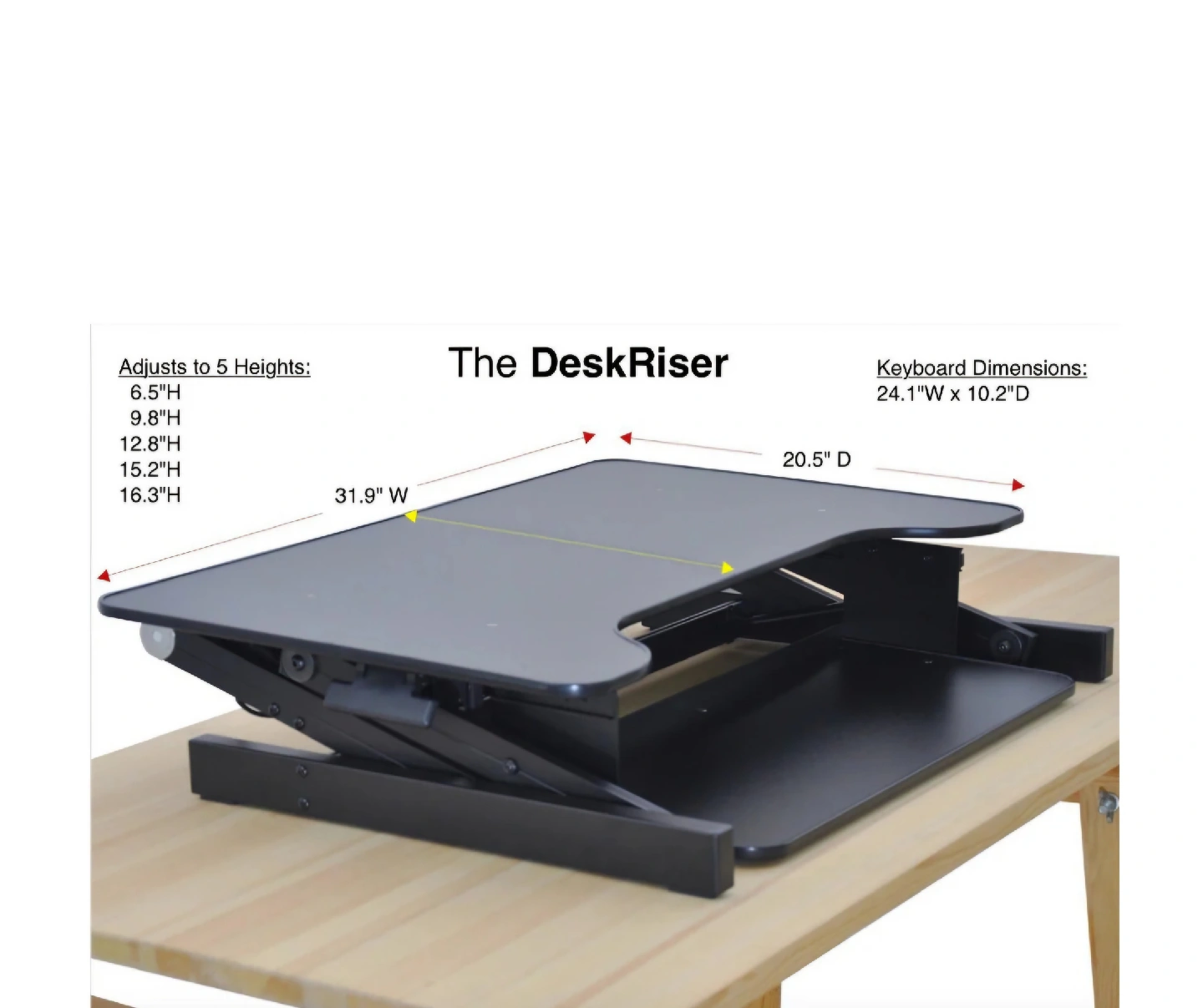 27Get yourself a The DeskRiser standing desk converter! It adjusts to 5 heights: 6.5", 9.8", 12.8", 15.2", and 16.3". Keyboard dimensions are 24.1" W x 10.2" D. The desk surface is 31.9" W x 20.5" D