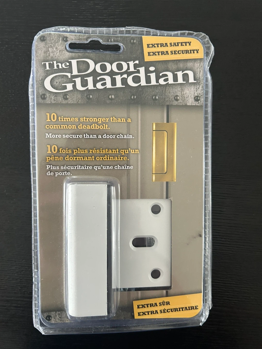 65Keep your loved ones safe and secure with The Door Guardian! It's 10 times stronger than a common deadbolt, providing extra security for your home. This is the DG01-W model in white. Instructions are included