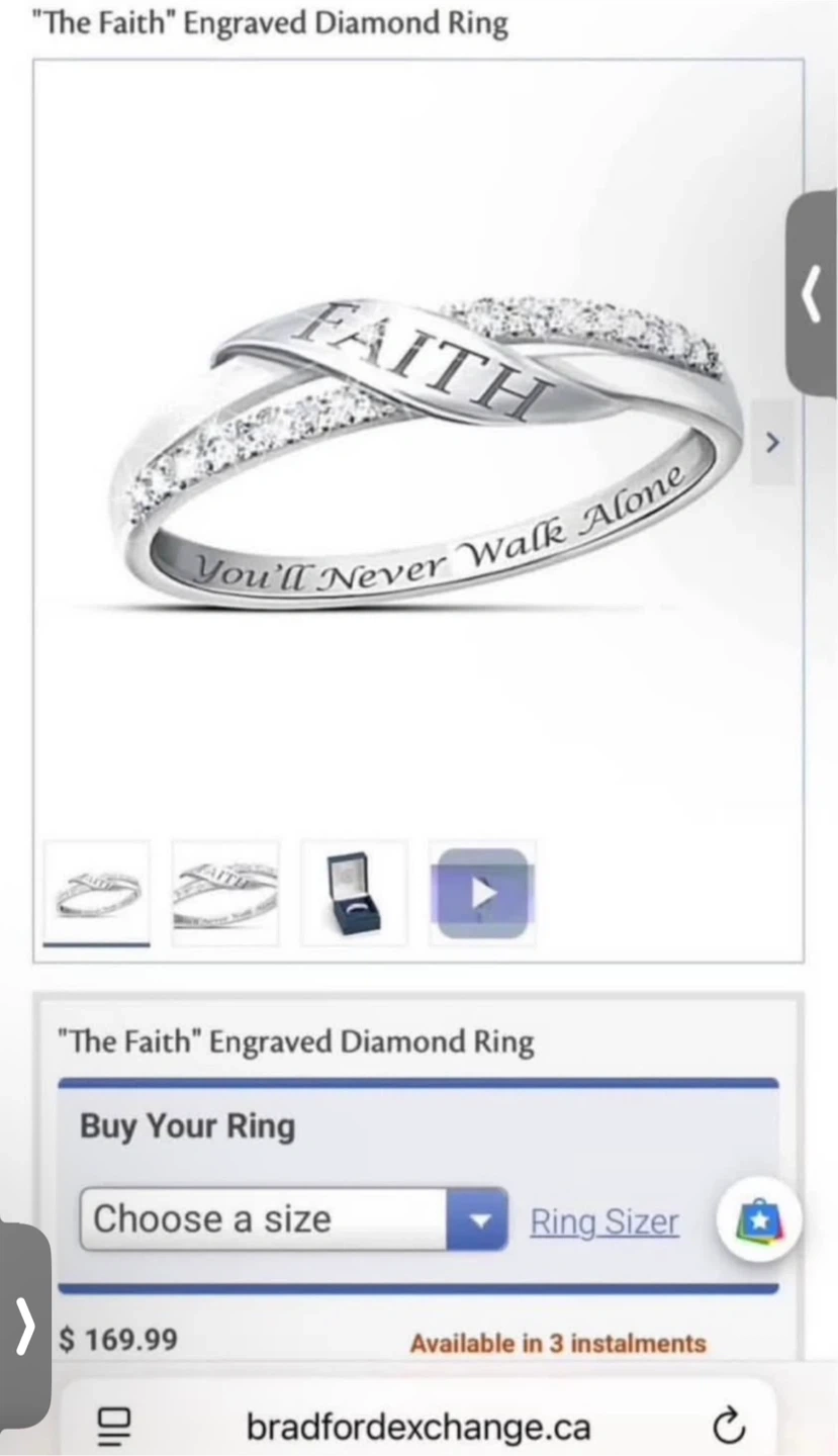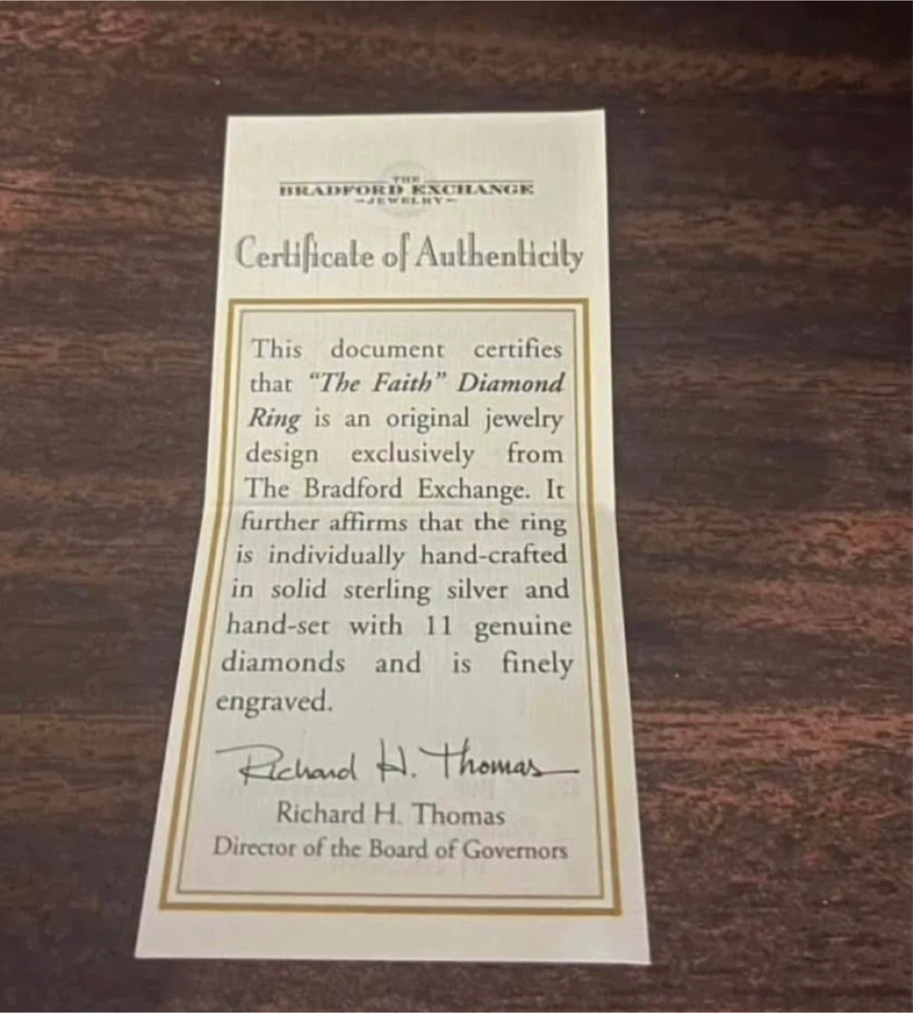 20Selling "The Faith" Diamond Ring from The Bradford Exchange. The ring is crafted in solid sterling silver and hand-set with 11 genuine diamonds and is finely engraved. Originally bought for $169.99. Comes with the original box and certificate of authenticity!