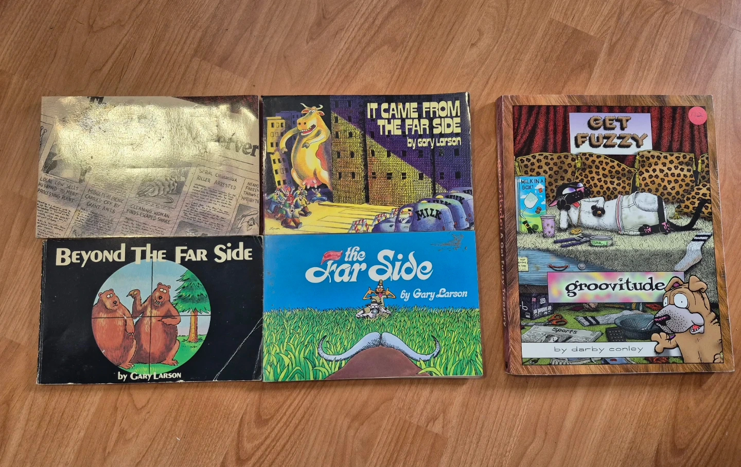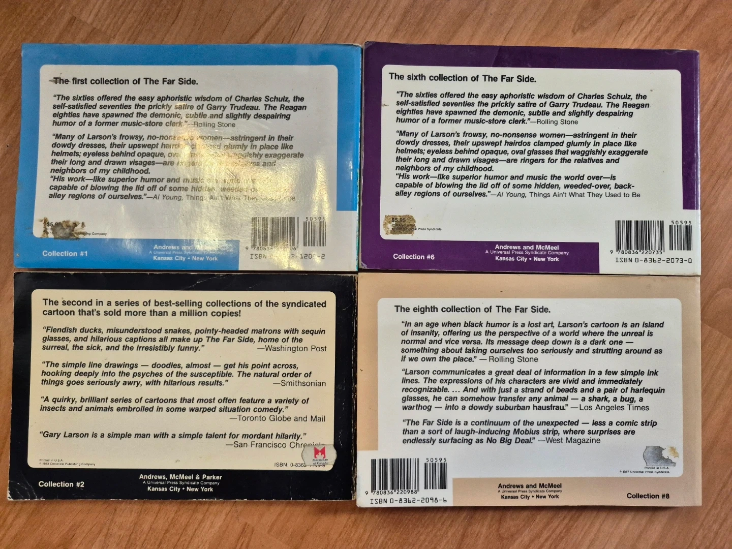 80Selling a collection of 'The Far Side' comic books by Gary Larson! These books are filled with Larson's quirky and humorous cartoons. Perfect for a fan or anyone who enjoys a good laugh! Included are collections #1, #2, #6, #8, and 'It Came From The Far Side', and 'Beyond The Far Side'. Also included is 'Get Fuzzy 2' by Darby Conley.