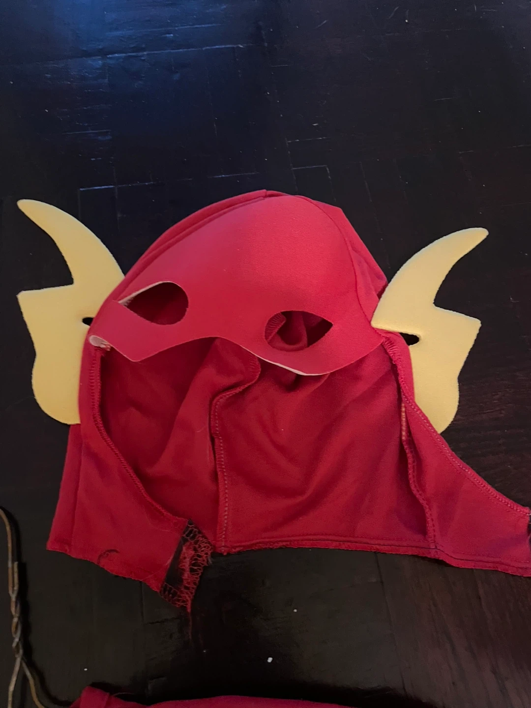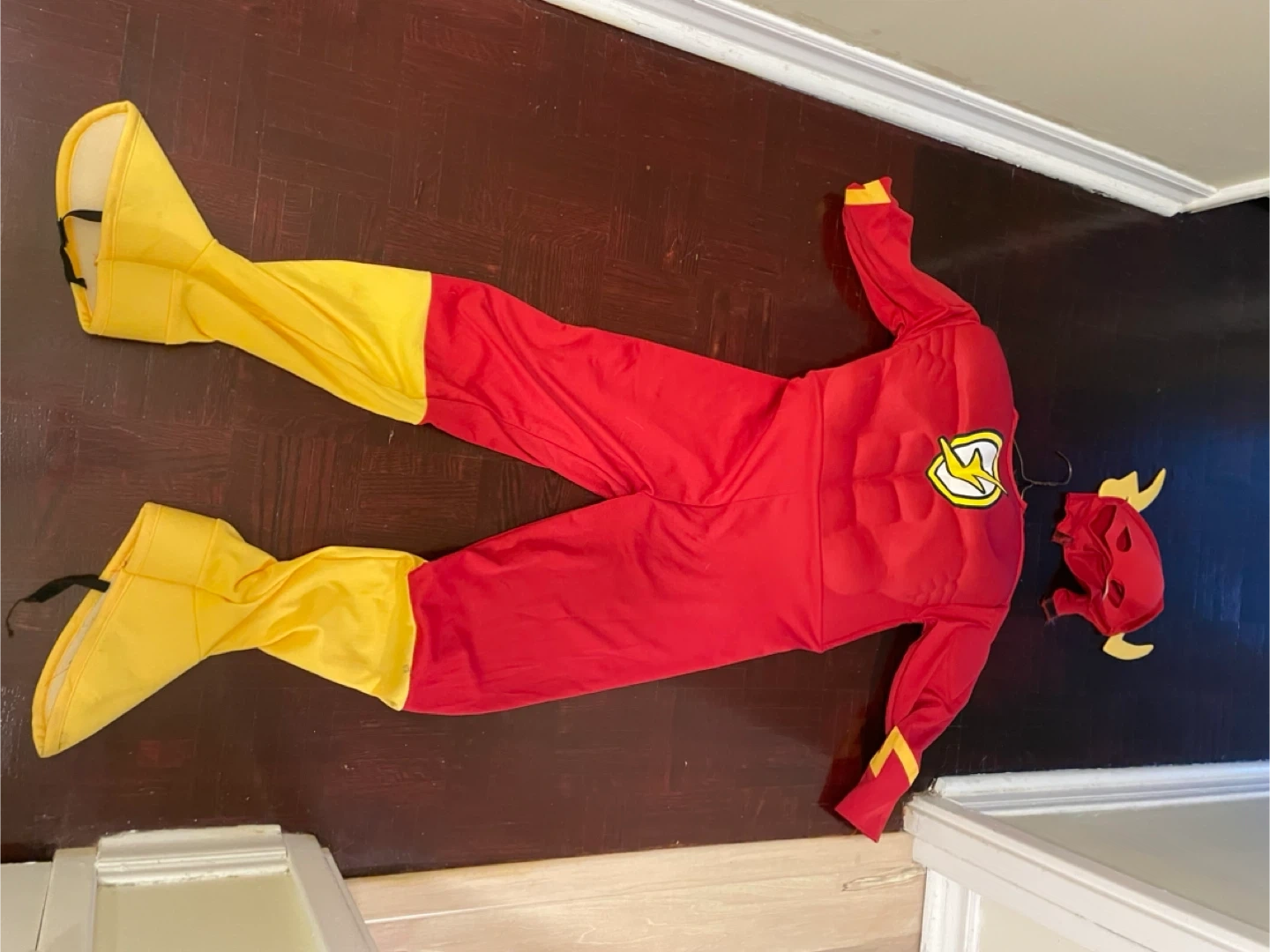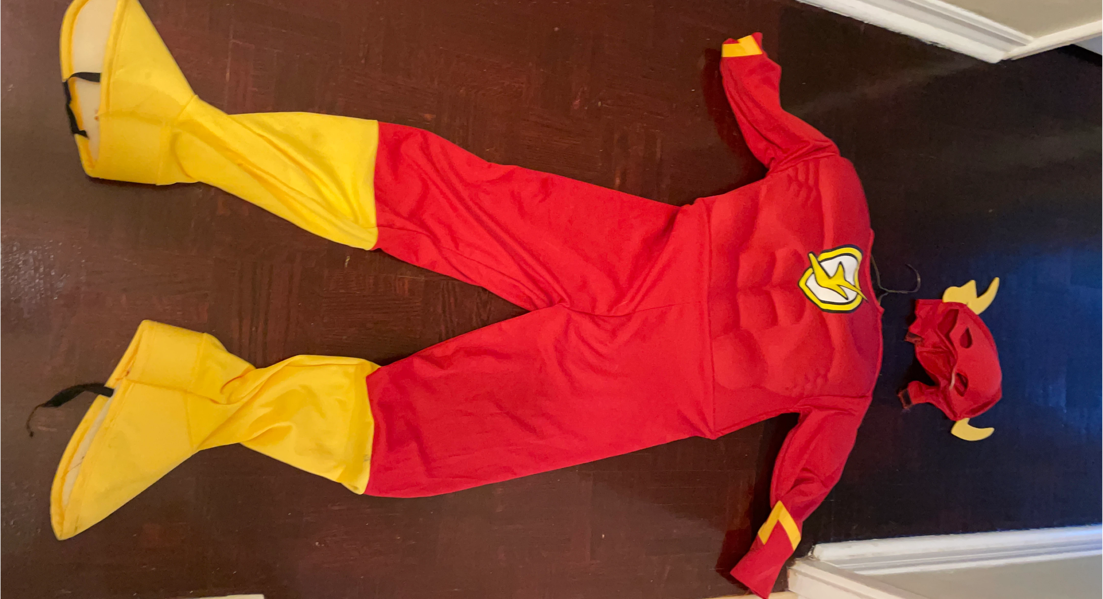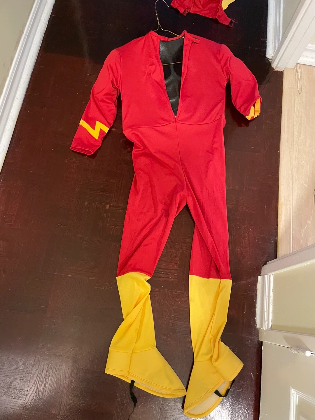 Selling a The Flash costume in red and yellow. Includes the jumpsuit, fake boots, and mask. Perfect for Halloween or dress-up! Boys size M
