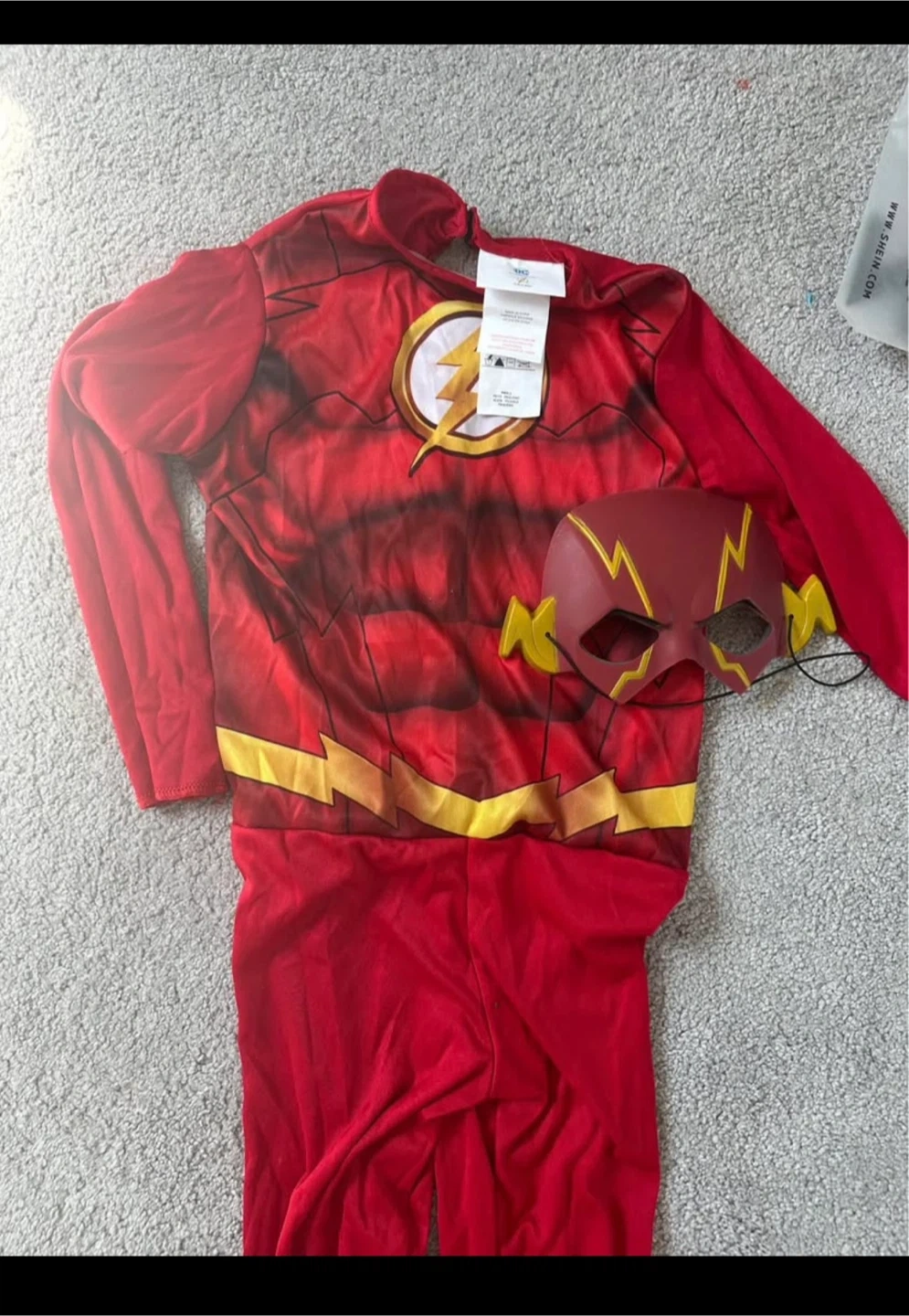Selling a fun Flash costume for kids! This set includes the full jumpsuit and a mask, perfect for dress-up or Halloween. It's in great condition and ready for a new superhero in training. Size is 4-6 year boy.