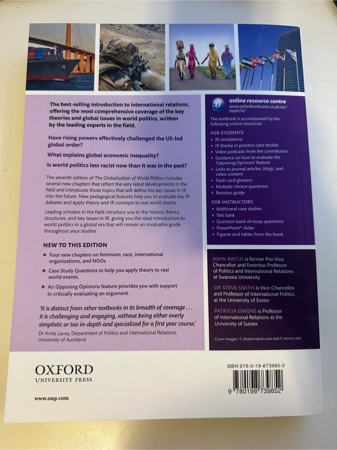 Selling "The Globalization of World Politics: An Introduction to International Relations", Seventh Edition by John Baylis, Steve Smith, and Patricia Owens. This book offers a comprehensive overview of international relations theory and global issues, written by leading experts in the field. It also includes online resources for students and instructors.