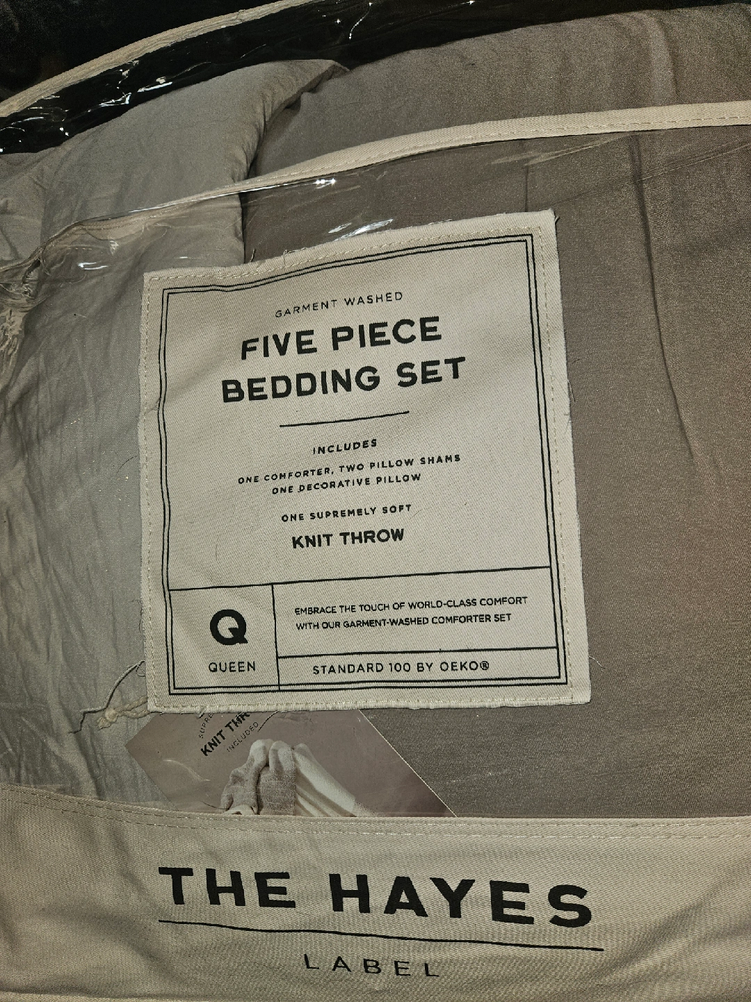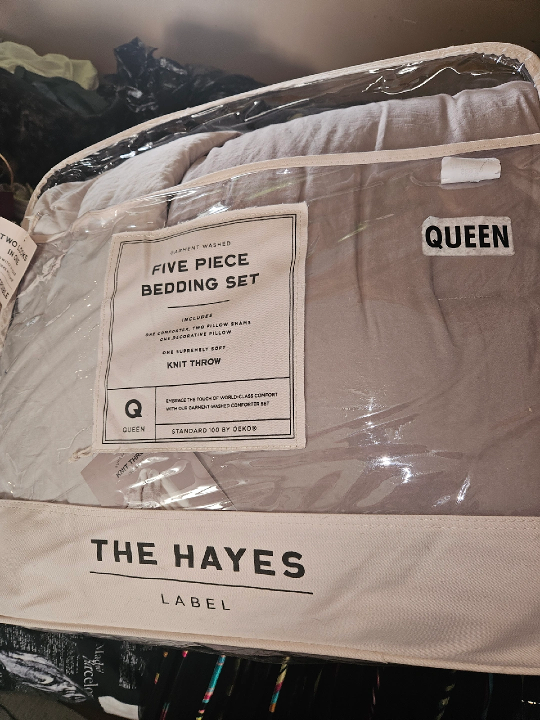 20Selling a brand new, in-package The Hayes Label five-piece bedding set, queen size! This garment-washed set includes one comforter, two pillow shams, one decorative pillow, and a knit throw. Embrace the touch of world-class comfort with this garment-washed comforter set