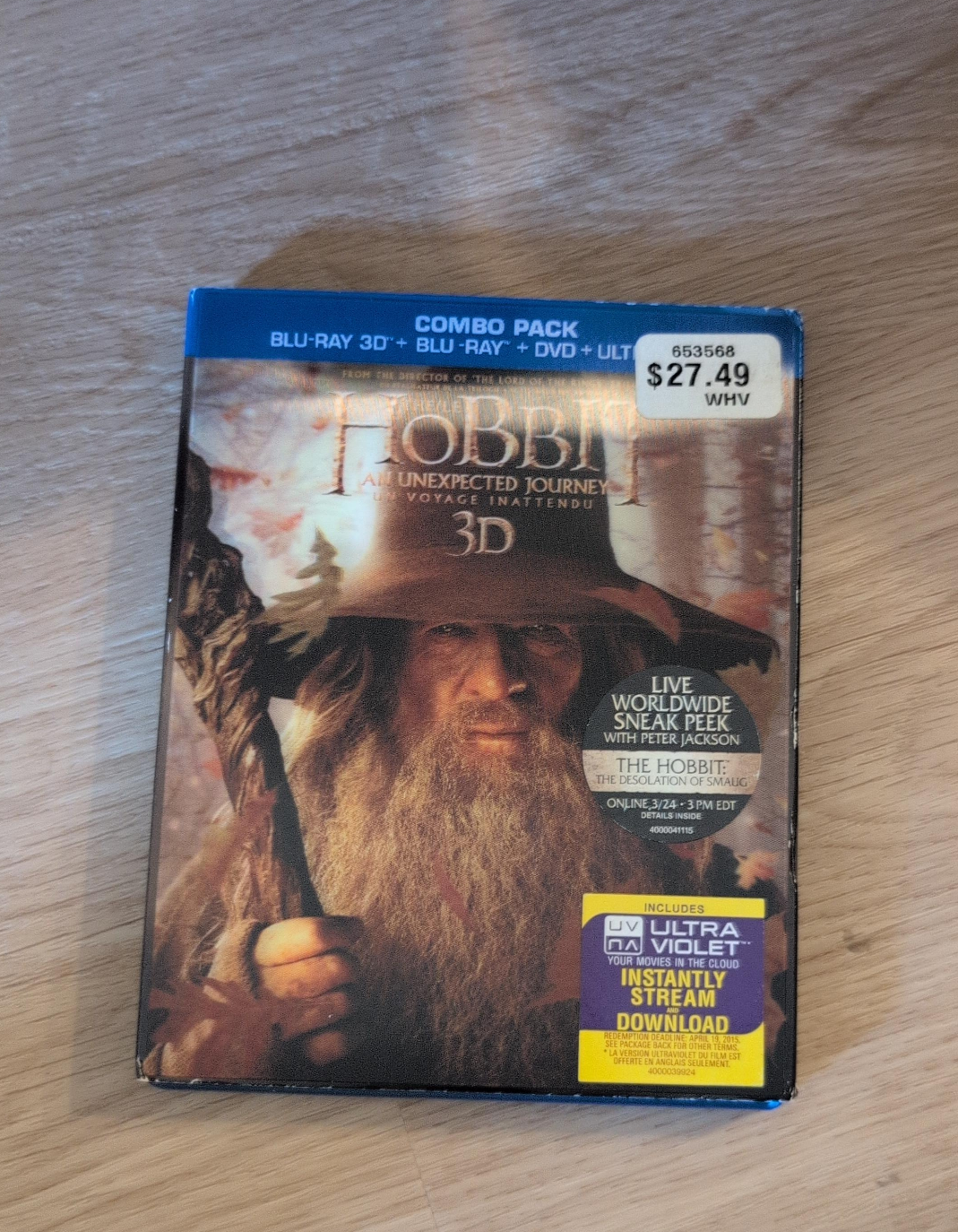 Selling a combo pack of The Hobbit: An Unexpected Journey on Blu-Ray 3D, Blu-Ray, DVD, and Ultraviolet! This edition includes a live worldwide sneak peek with Peter Jackson for The Hobbit: The Desolation of Smaug. Originally priced at $27.49