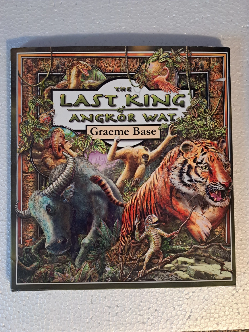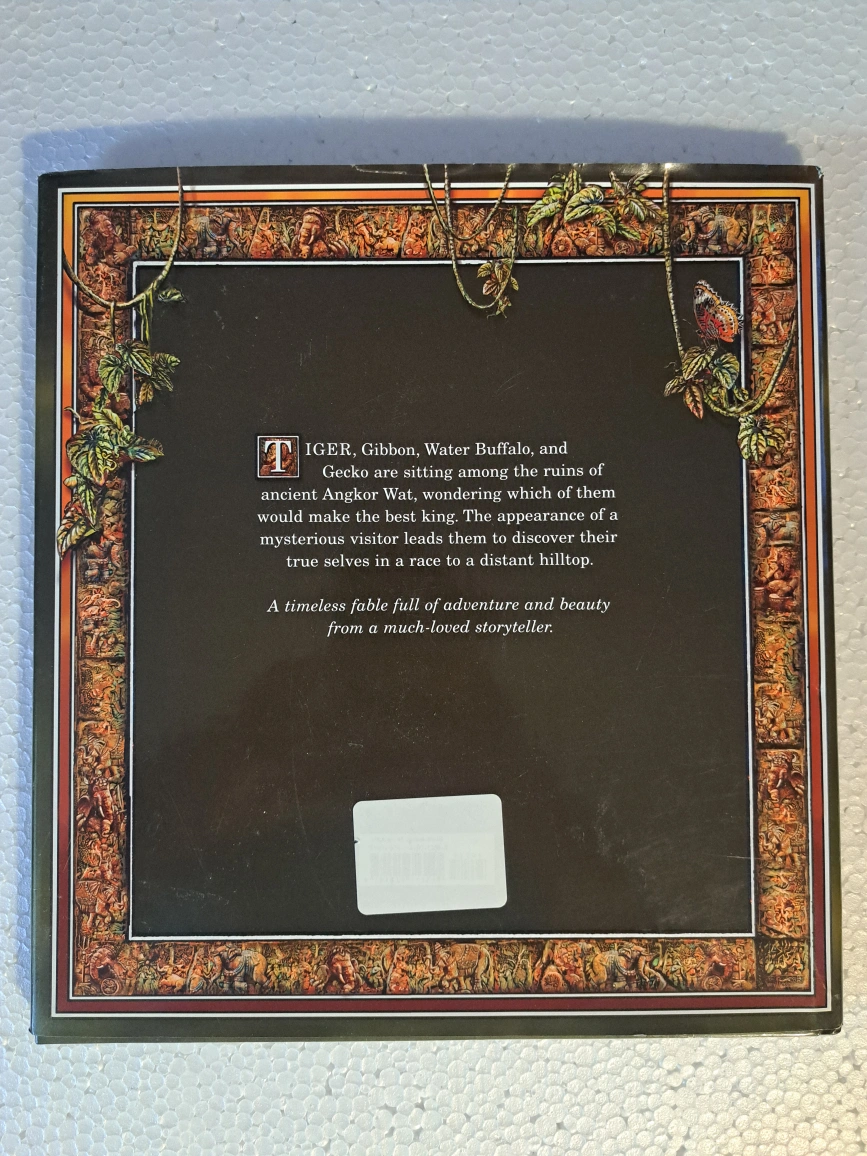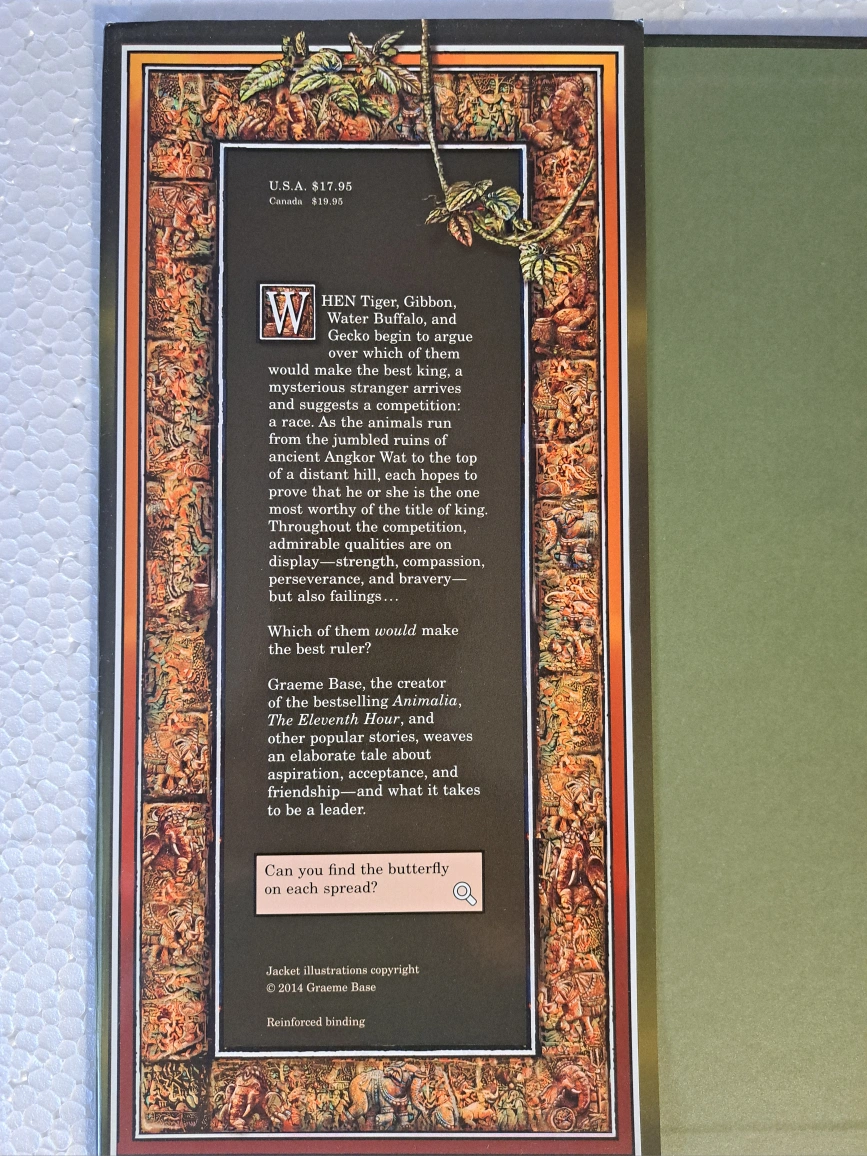 72Beautifully illustrated picture book by children's author Graeme Base. Story is about Tiger, Water Buffalo, Gecko, and Gibbon racing to see which one is the best king, but instead discovering the ways in which they must grow in order to be worthy. hardcover, published 2014, original selling price $19.95 Book jacket has some slight creasing and dents but no tears.