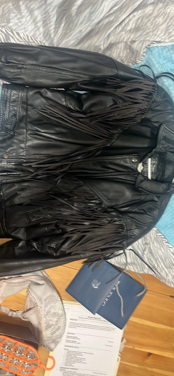 Here's a cool leather jacket from The Leather Ranch! It's a size 2 and features a fun fringe design. Perfect for adding a bit of flair to your outfit!
