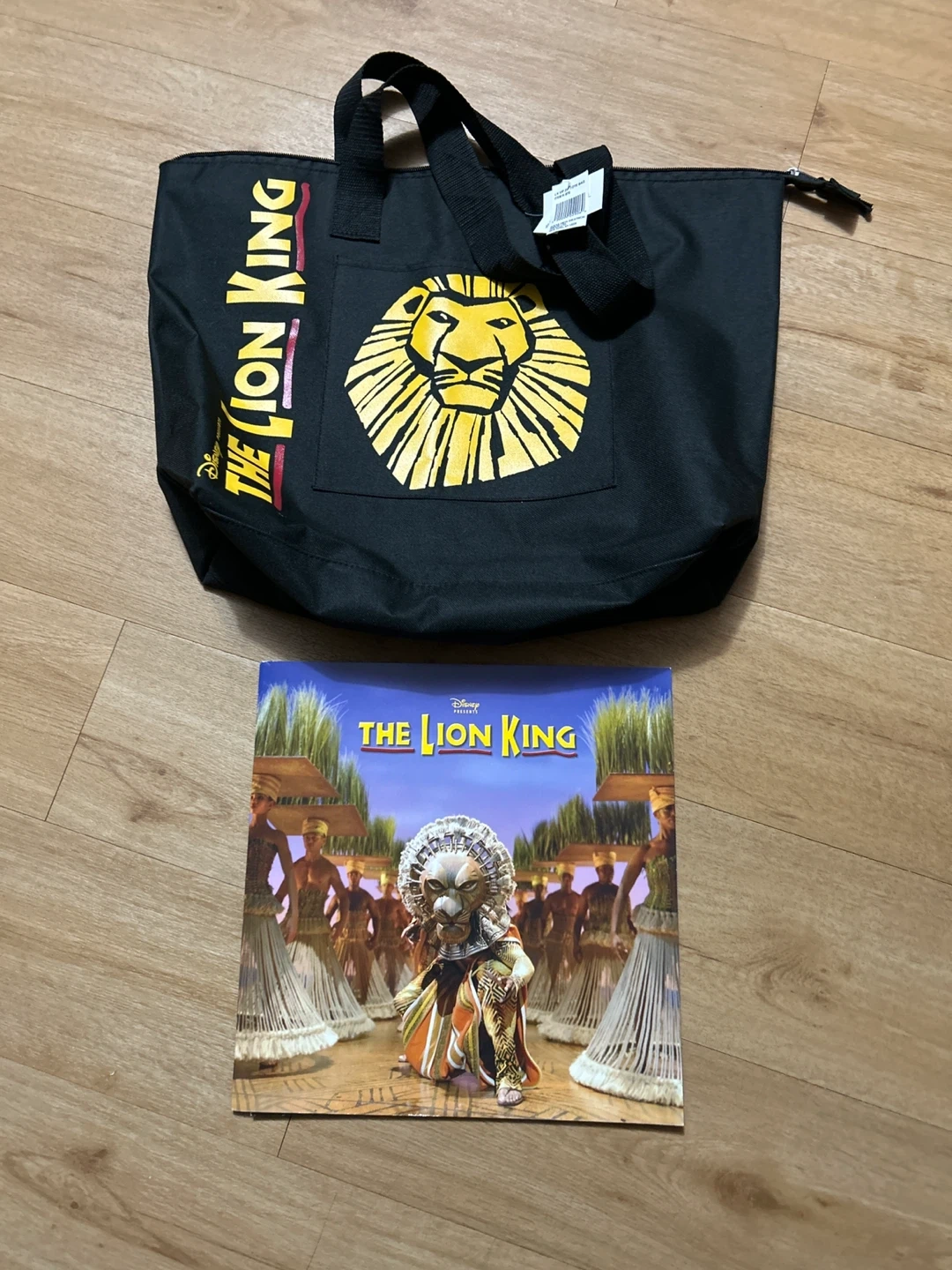 Selling a black tote bag featuring The Lion King logo and a playbill from the Disney production. The bag is in great shape and perfect for carrying books or groceries. The playbill is a nice souvenir for any fan of the musical!