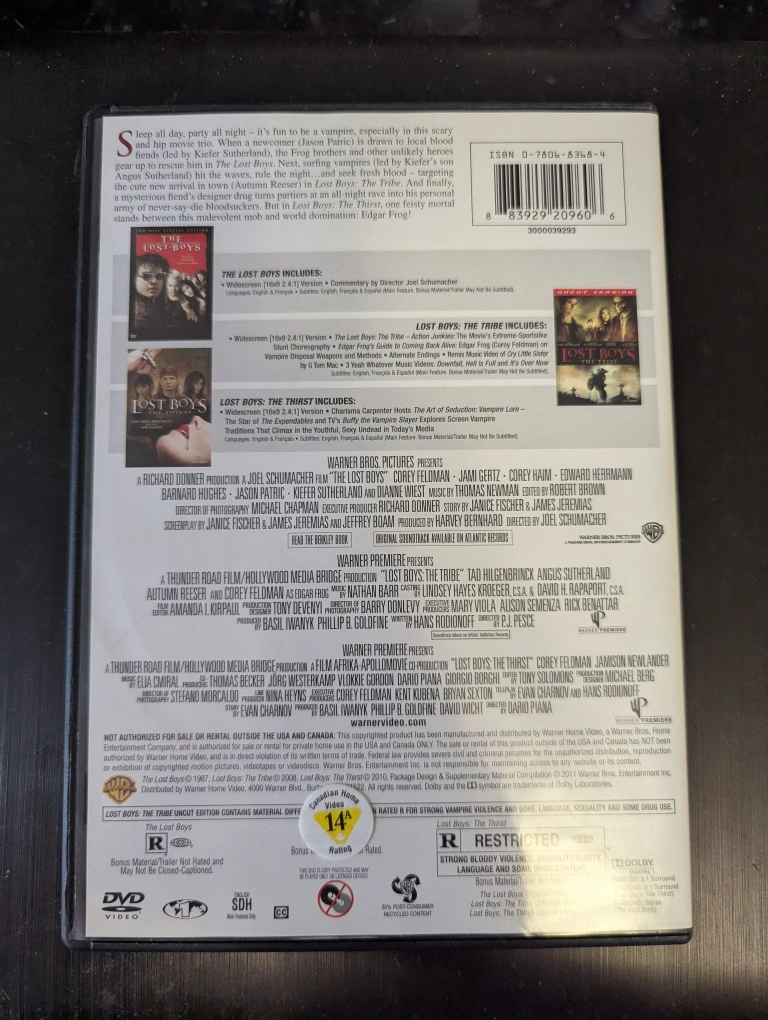 3-Movie Collection includes The Lost Boys, The Lost Boys: The Tribe, and The Lost Boys: The Thirst. Region 1 DVD. Pickup only. Cash Only. Pickup at 25 Richview Road near Scarlett road and Eglinton Avenue West. Please check out my other listings.