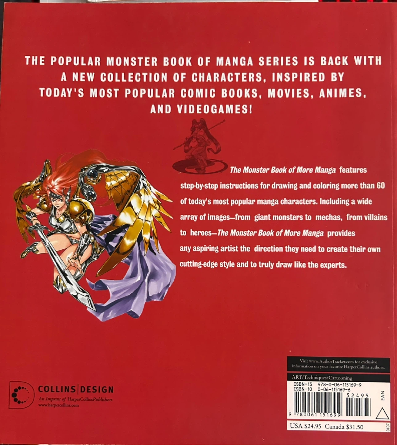 60I'm selling The Monster Book of More Manga. This book features step-by-step instructions for drawing and coloring more than 60 of today's most popular manga characters. It includes a wide array of images from giant monsters to mechas, from villains to heroes. Originally retailed for $31.50 in Canada