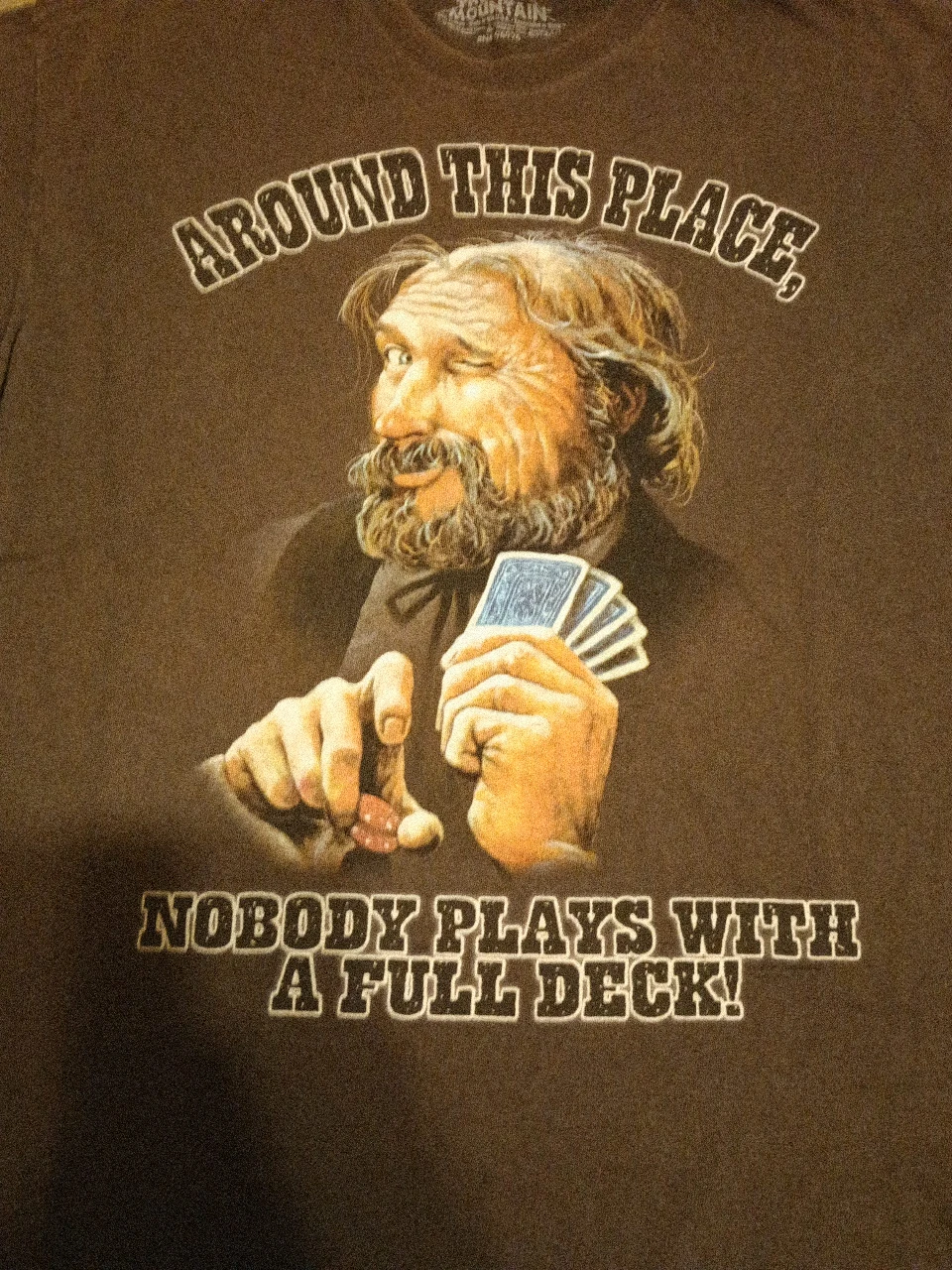 20Selling a t-shirt from The Mountain featuring a graphic print. The shirt is brown and has the text "AROUND THIS PLACE, NOBODY PLAYS WITH A FULL DECK!"