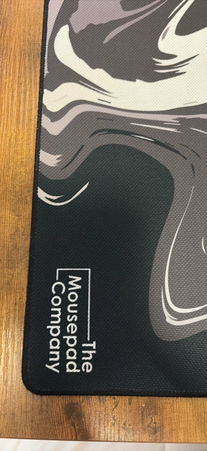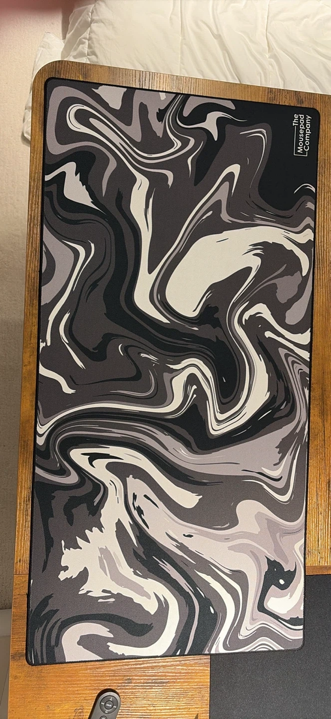Selling a desk mat from The Mousepad Company. It features a cool swirl design in shades of grey, black, and white. It's in great condition and would be a stylish addition to any desk setup!