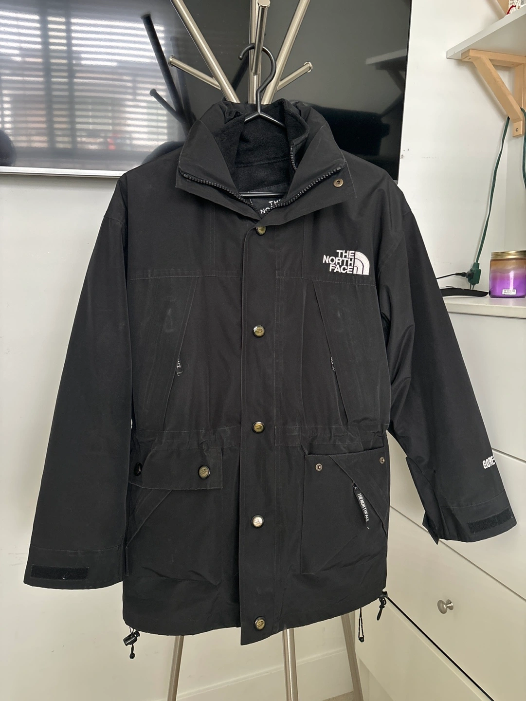 Black jacket with a zipper and button closure, a hood, and multiple pockets. The North Face logo is visible on the chest.