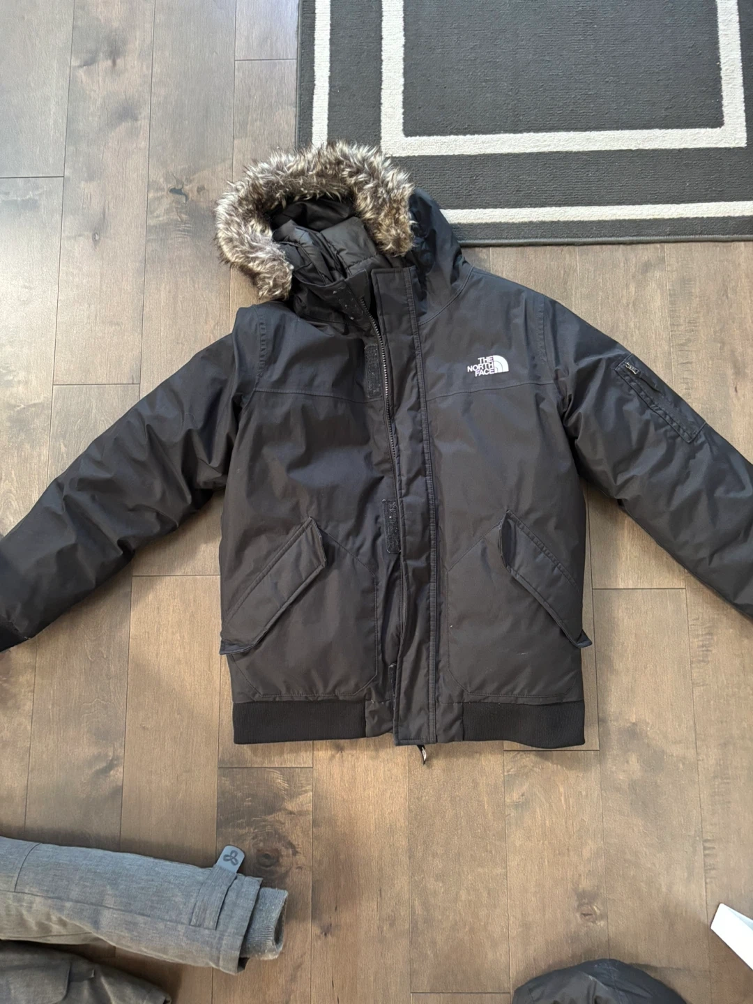 Selling a black winter jacket from The North Face. It's in great condition and ready to keep you warm this winter! It features a faux fur trim on the hood and a classic bomber style. Boys Size X large
