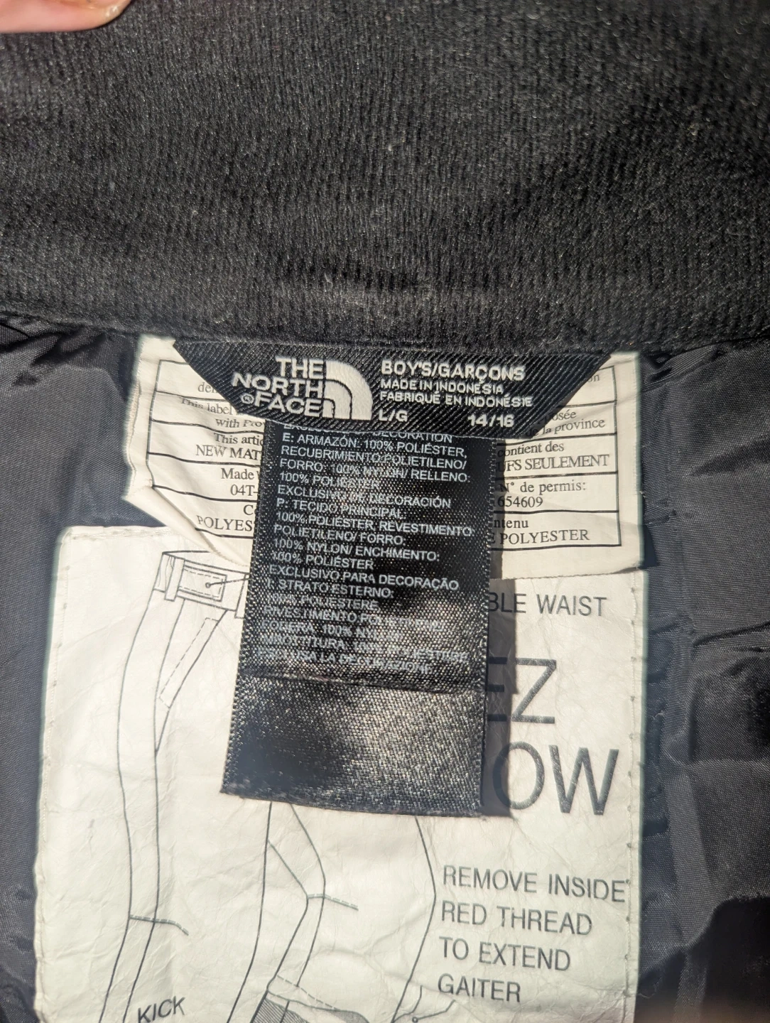 18Selling a pair of The North Face boys' ski pants in size L (14/16). They're black and made of 100% polyester. These pants feature an adjustable waist and an EZ Grow system, allowing you to remove the inside red thread to extend the gaiter and hem. Perfect for hitting the slopes!