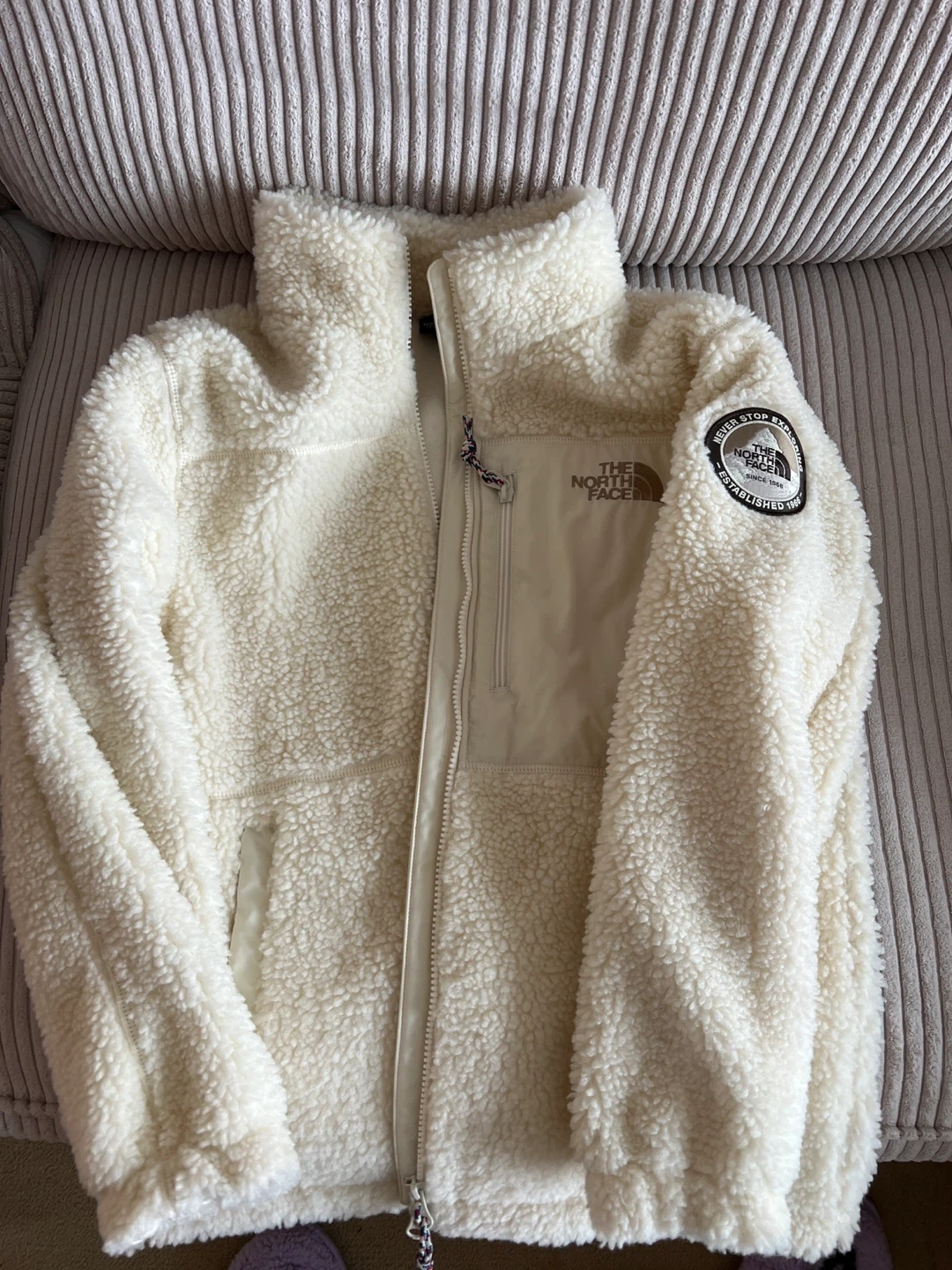 34Cozy up in this cream-coloured fleece jacket from The North Face! It's in great condition and ready to keep you warm. Perfect for those chilly Canadian evenings!