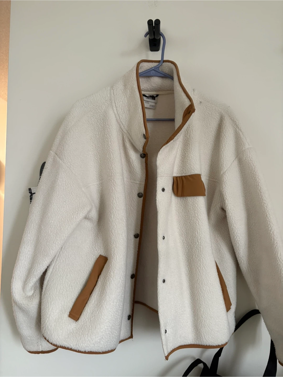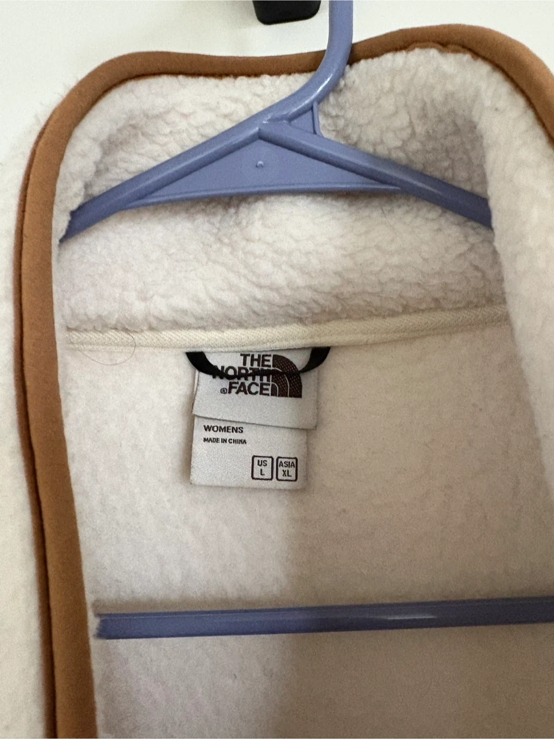 107Here's a cozy The North Face fleece jacket, perfect for chilly days! It's a women's size L/XL and in great condition. The jacket is a lovely off-white colour with brown trim. It's super soft and comfy, you'll love it!