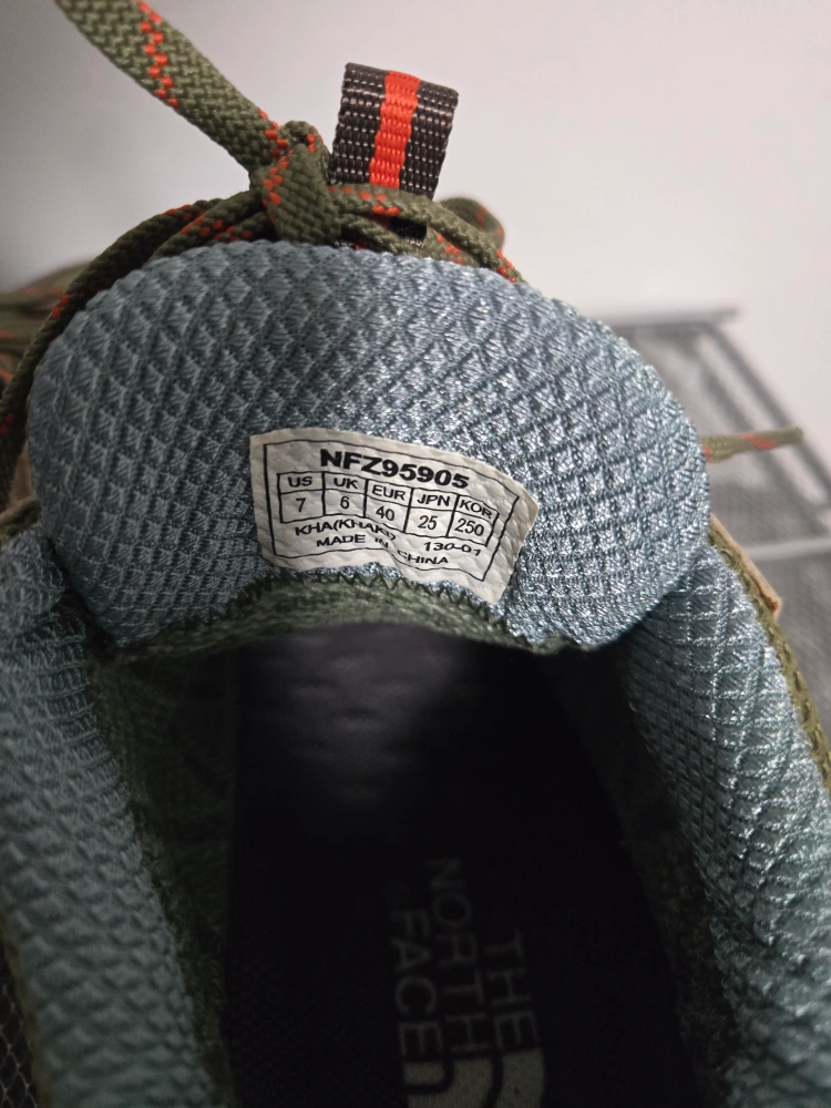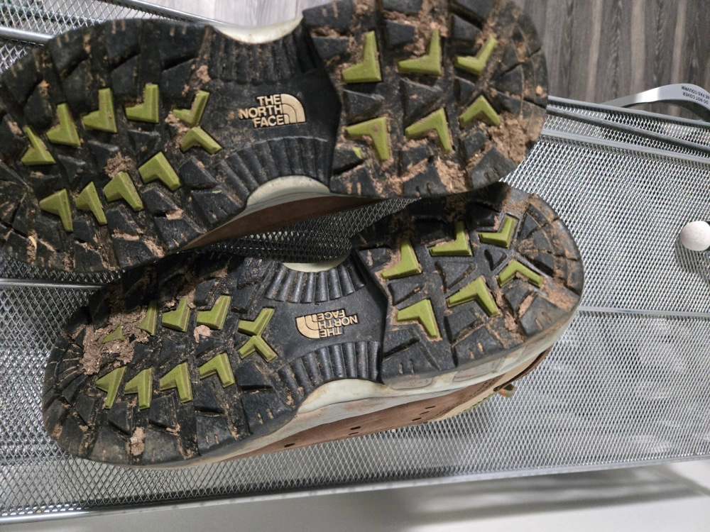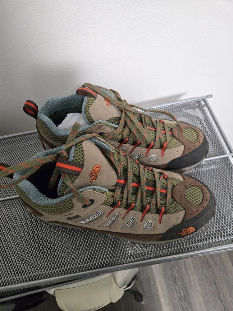 437Used women's The North Face hiking shoes. Size 7. Green and brown colour. Show some wear.
