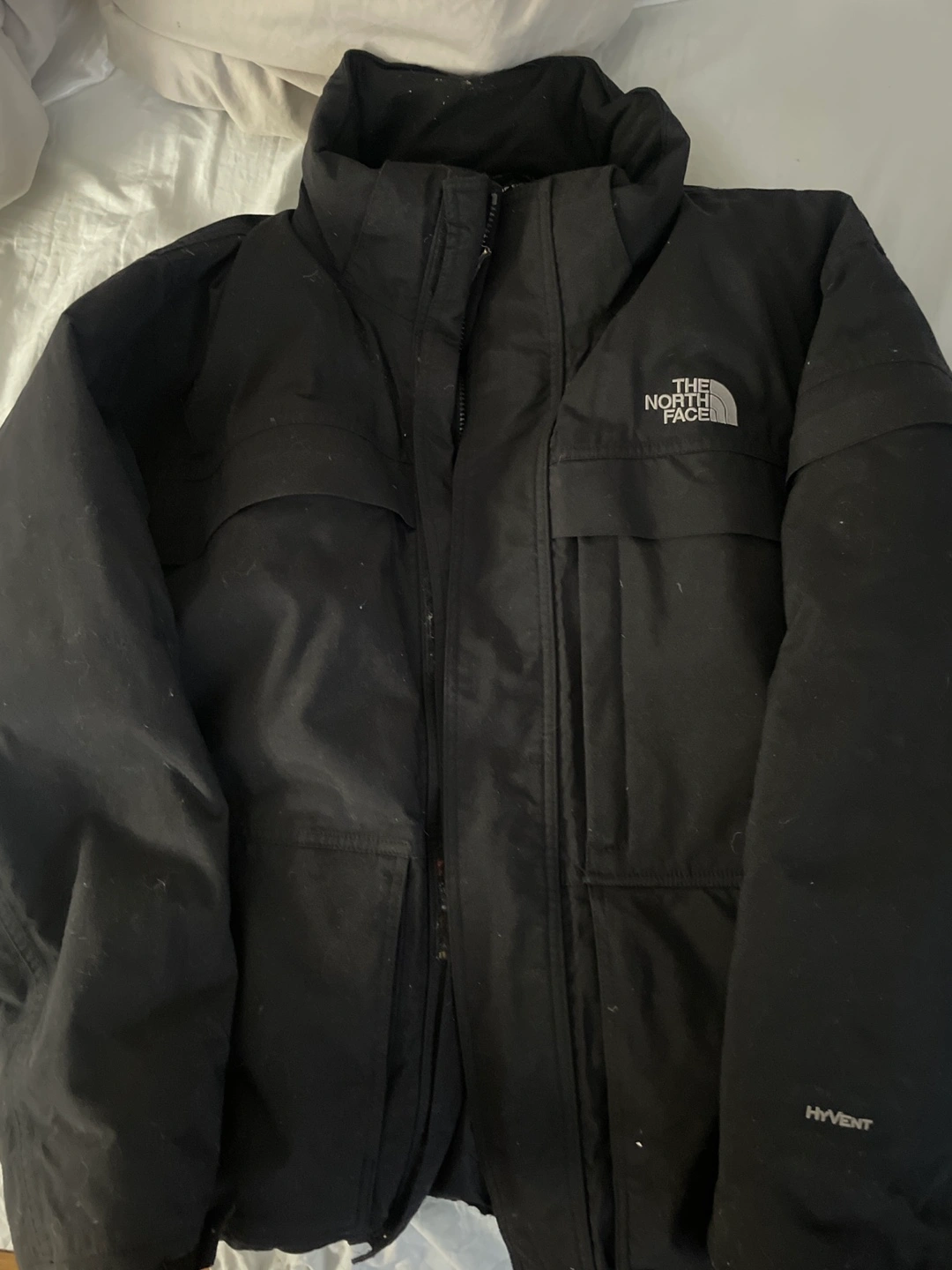 10Men's large/large The North Face HyVent jacket. Black colour. Features zipper closure and pockets. Durable outer shell.