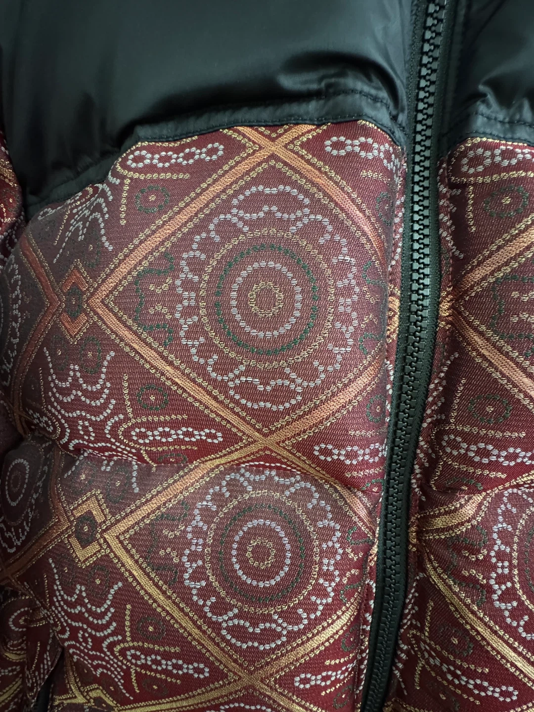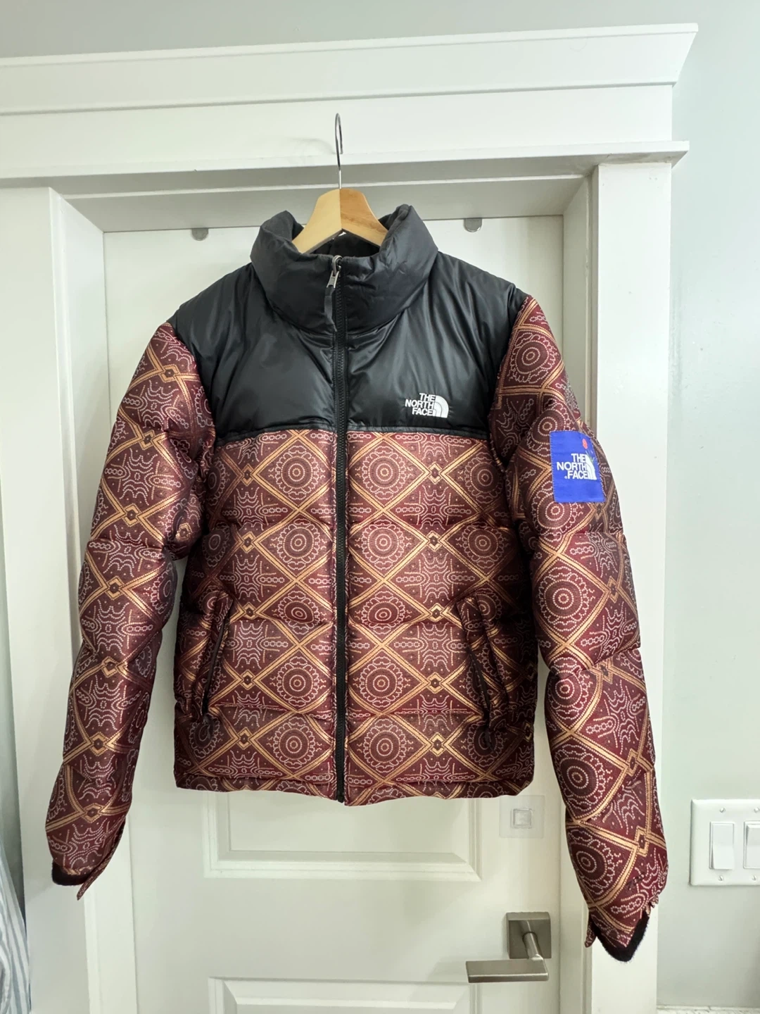 68The North Face Nuptse 700 down fill jacket, new without tag! Unique silk fabric combine with classic Nuptse design, sold out everywhere! with a striking burgundy geometric design and black shoulders. Ideal for warmth and style.