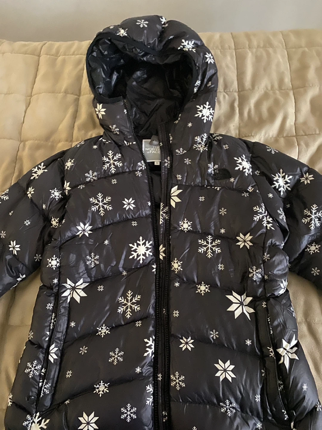 26Selling a gently used The North Face puffer jacket in black with a snowflake pattern. It's a size medium and in great condition! Perfect for staying warm and stylish this winter season. Kids M 14-16 or adult XS.