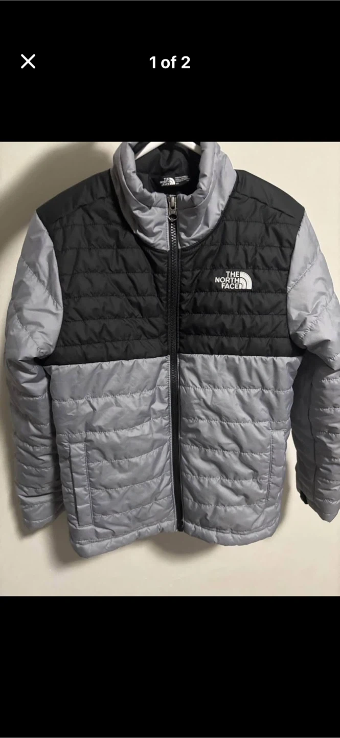 Selling a The North Face puffer jacket in black and grey. Size 7/8 It has some minor stains, as shown in the pictures, but is otherwise in good condition. Great for staying warm during the colder months!