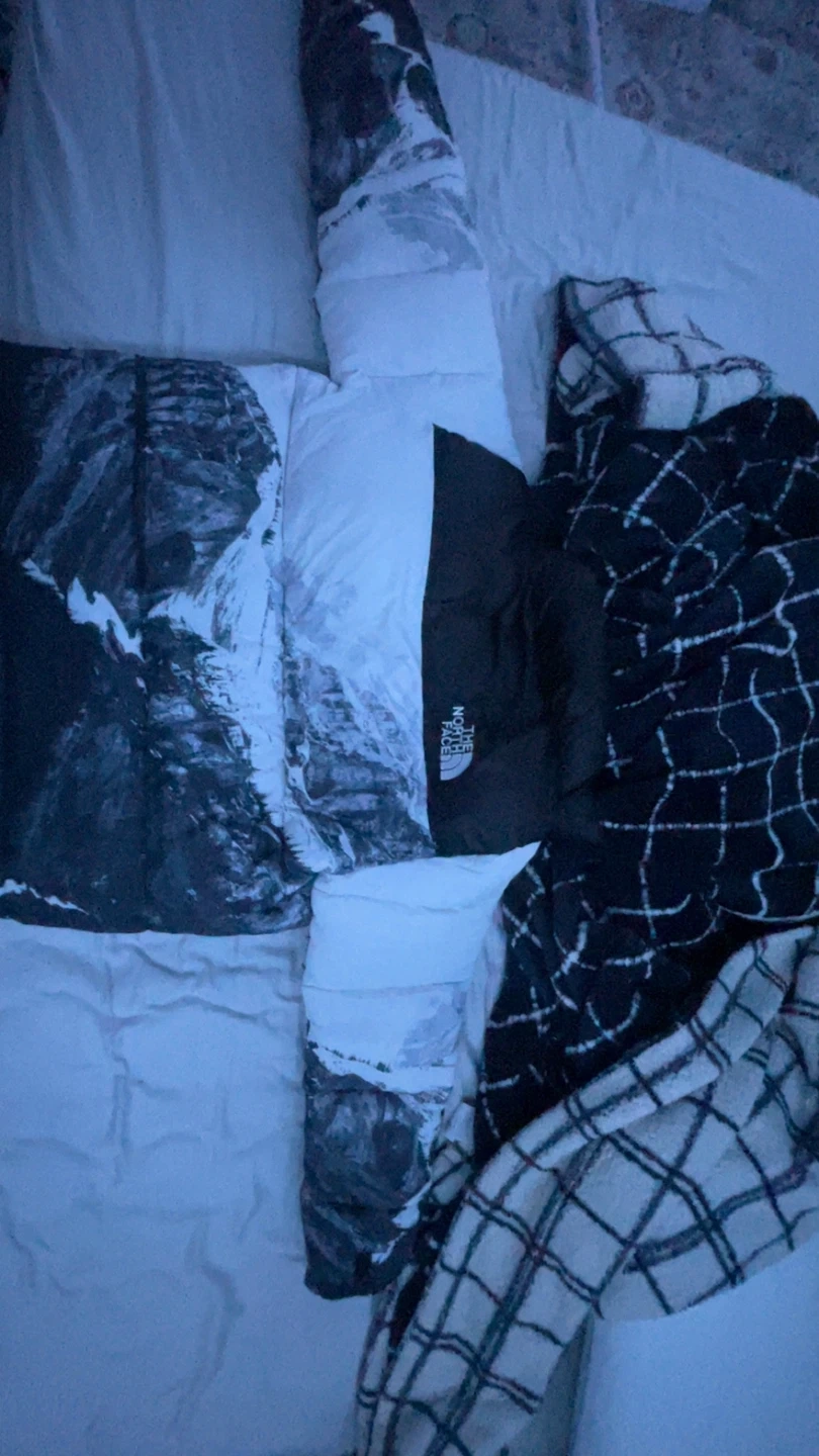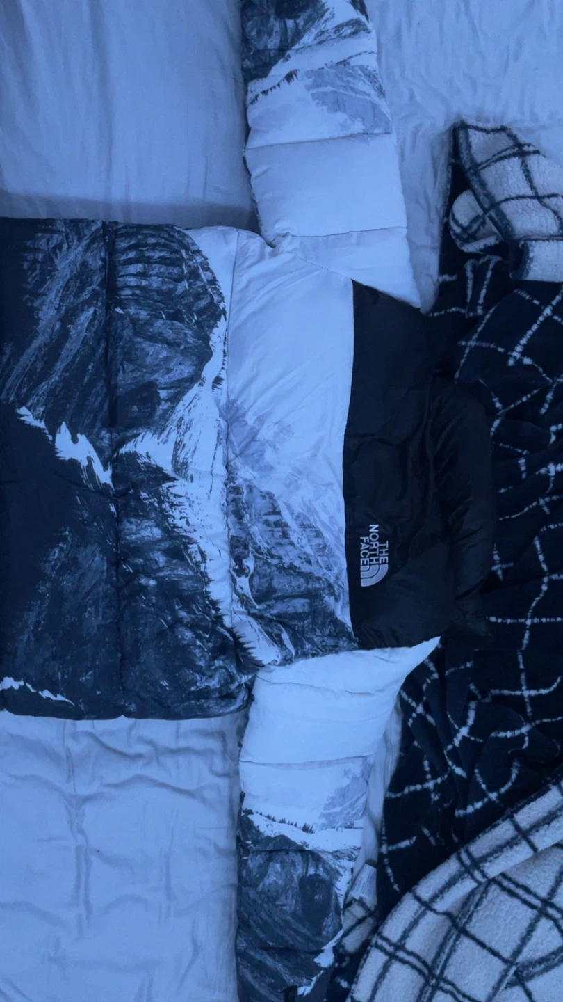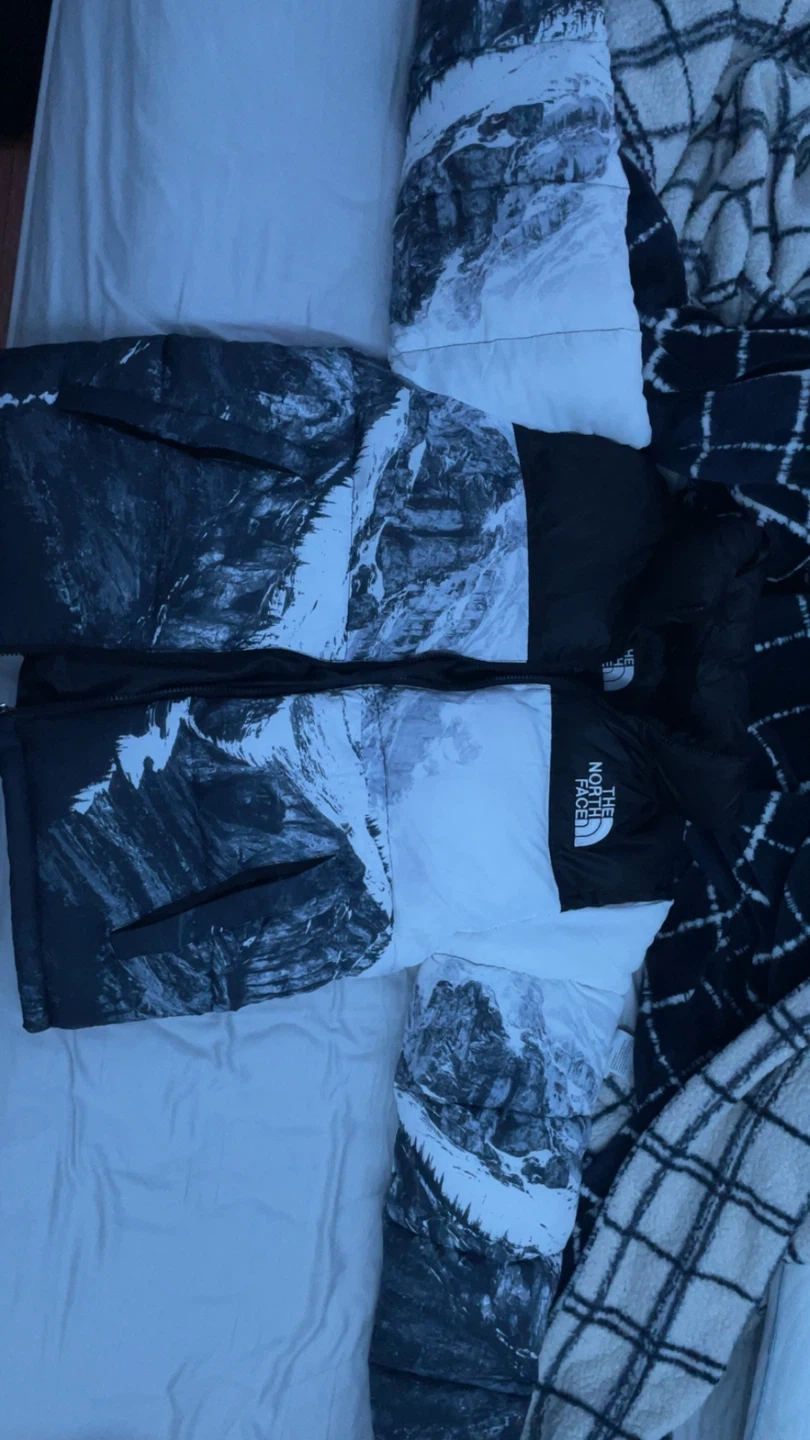 15Selling a The North Face puffer jacket in size medium. It has a unique black and white mountain print design. The jacket is made of 100% nylon lining and shell.
