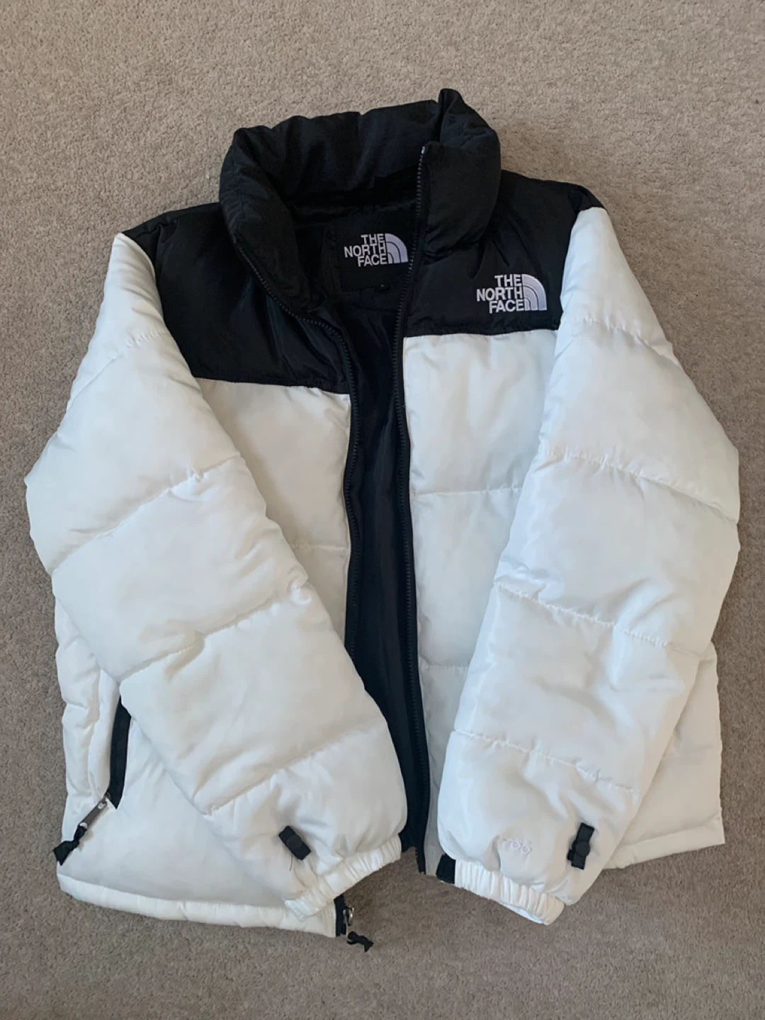 Selling a stylish The North Face puffer jacket in a classic white and black colourway. It's in great condition and ready to keep you warm this winter! The jacket features the iconic North Face logo. Perfect for everyday wear or outdoor adventures