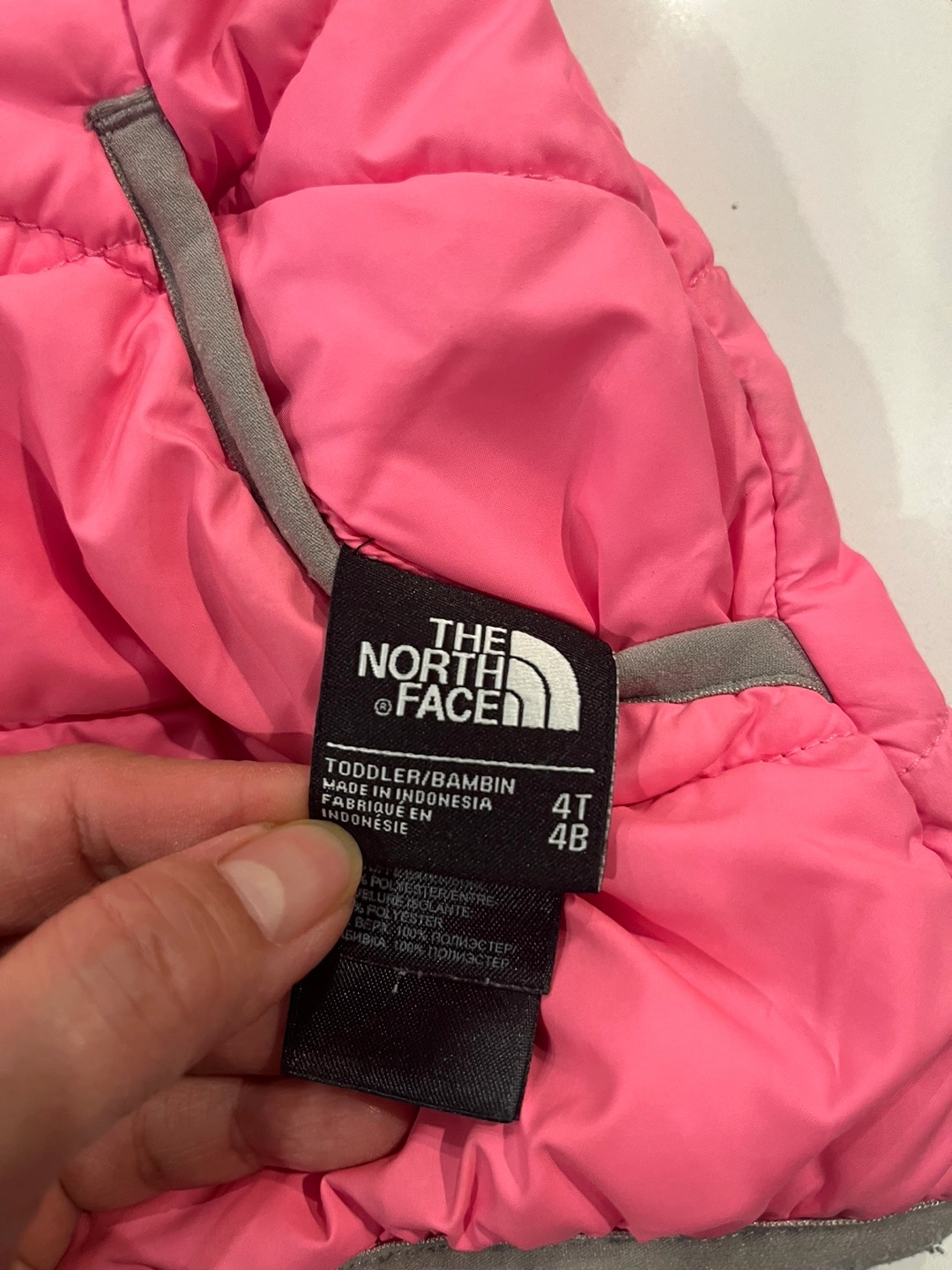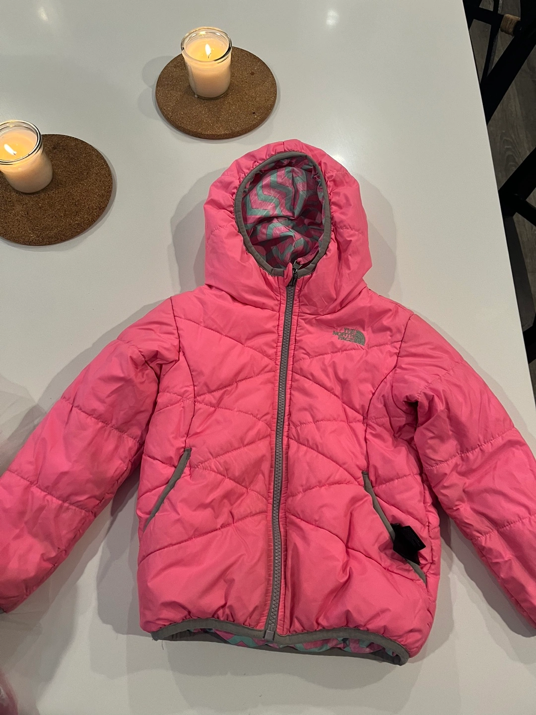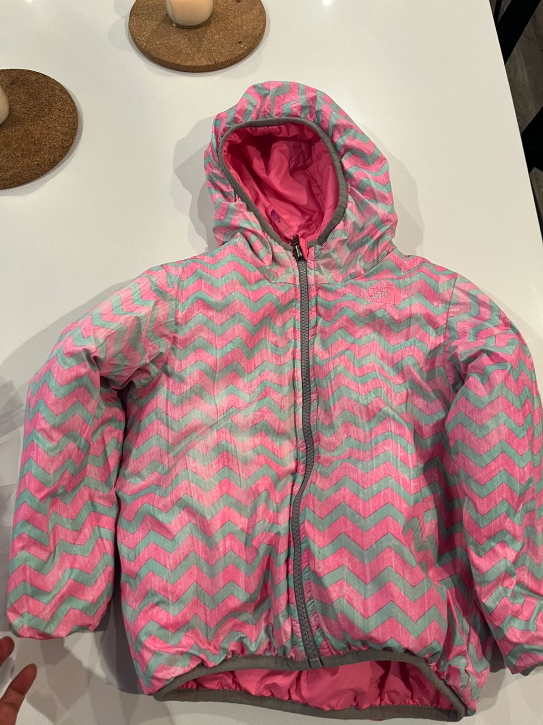 Reversible Pink chevron puffer jacket with a hood. Zipper closure. Two pockets.