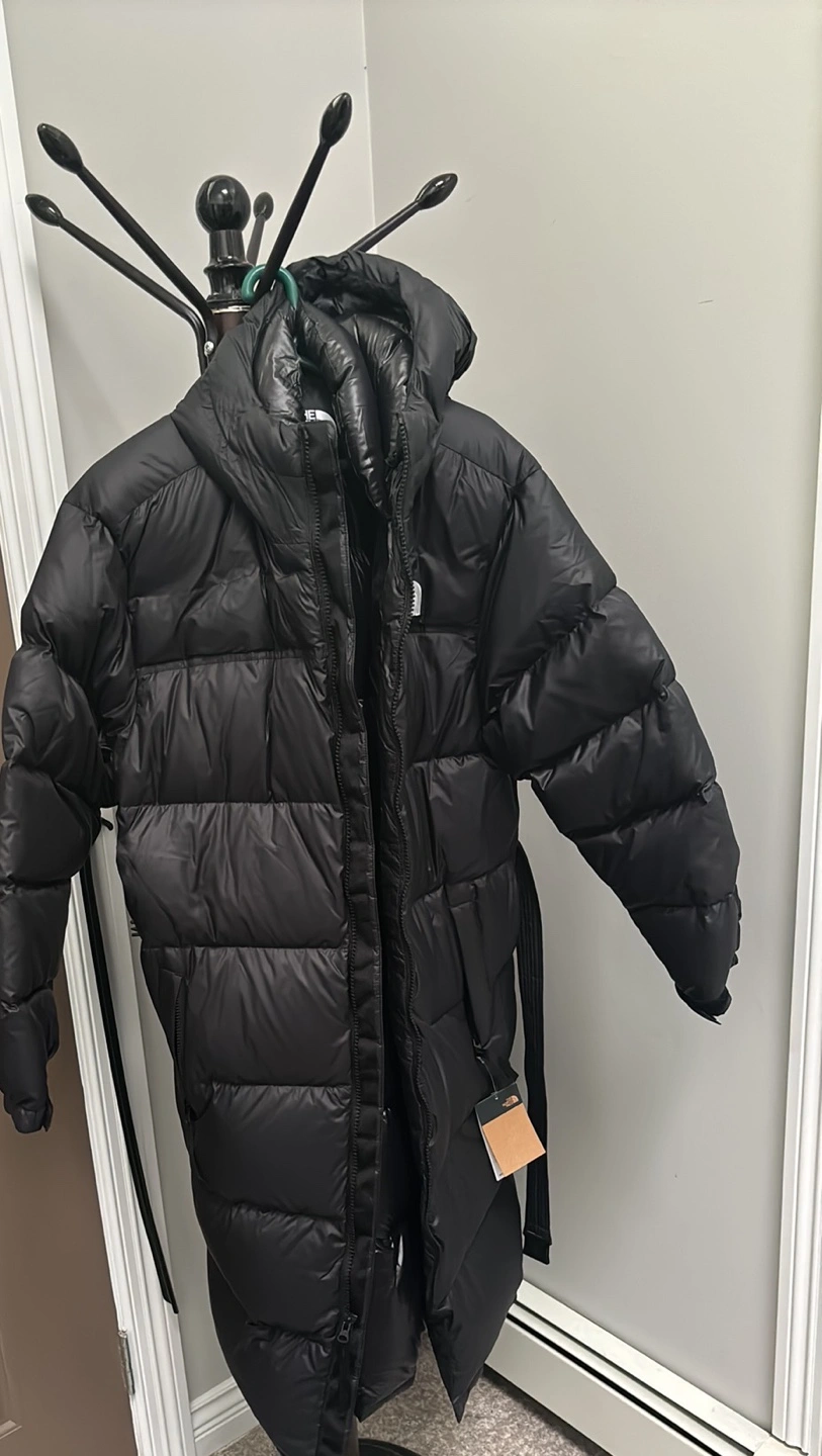Black, Size XL. Long puffer jacket with belt. Was 638 with tax Slightly big Missed return period Great for Cold temperatures No try ons