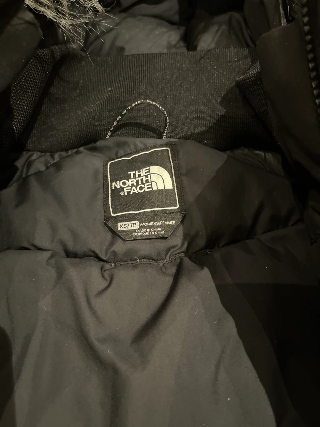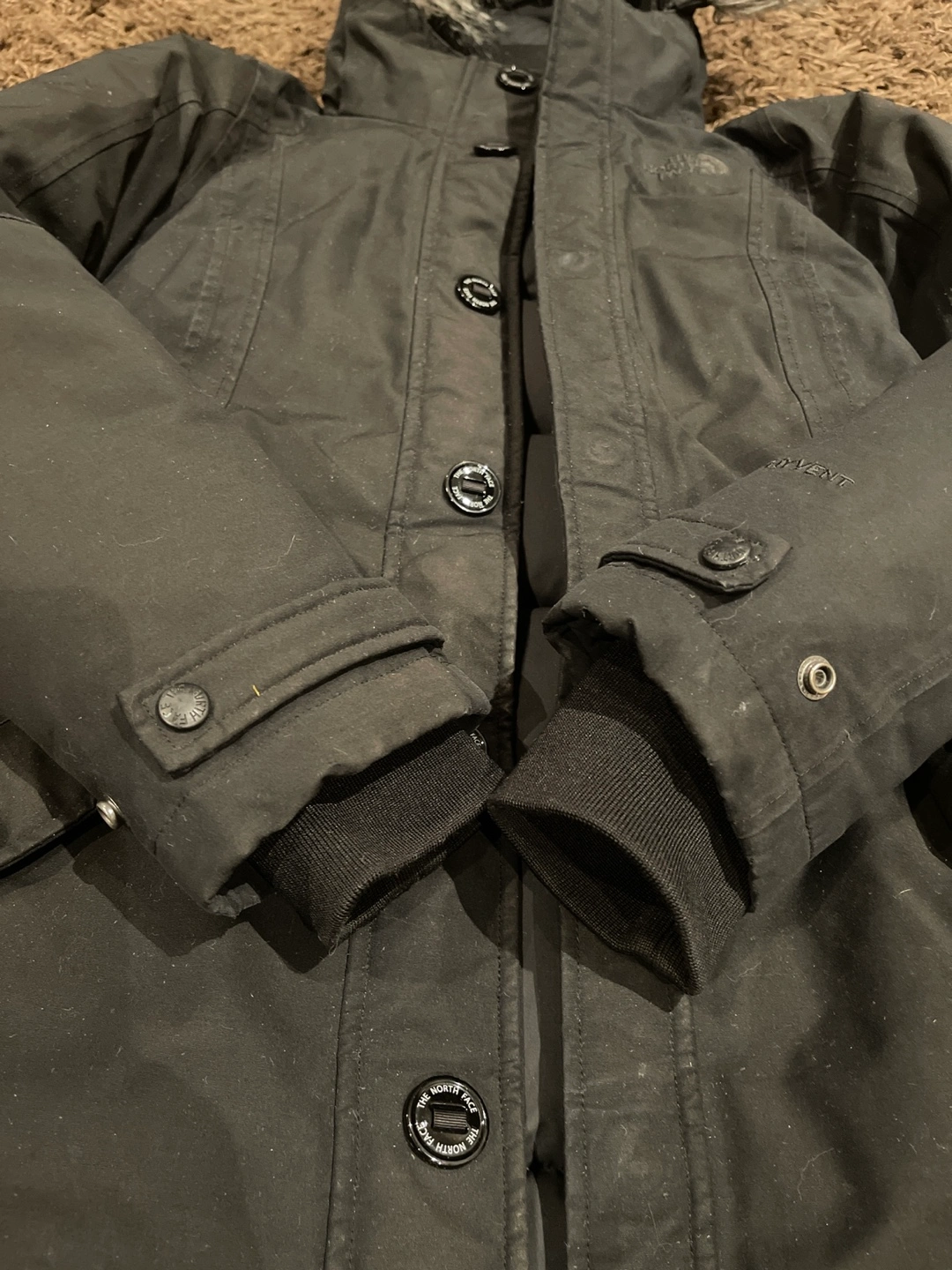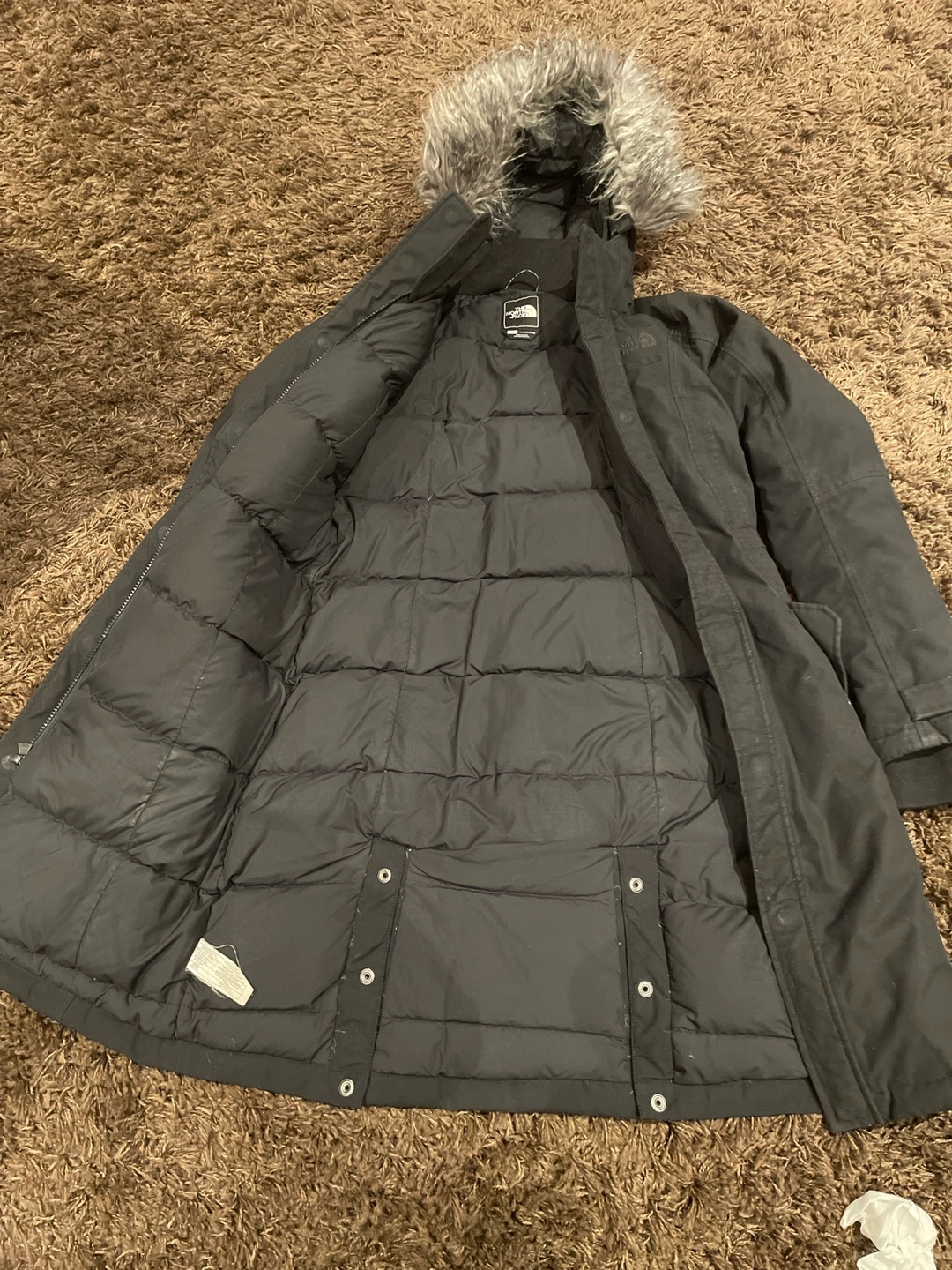 Used Black long winter parka with faux fur hood. It shows normal wear and tear,but no big rip and tears.it still is warm for winter.only selling because too small for me now.