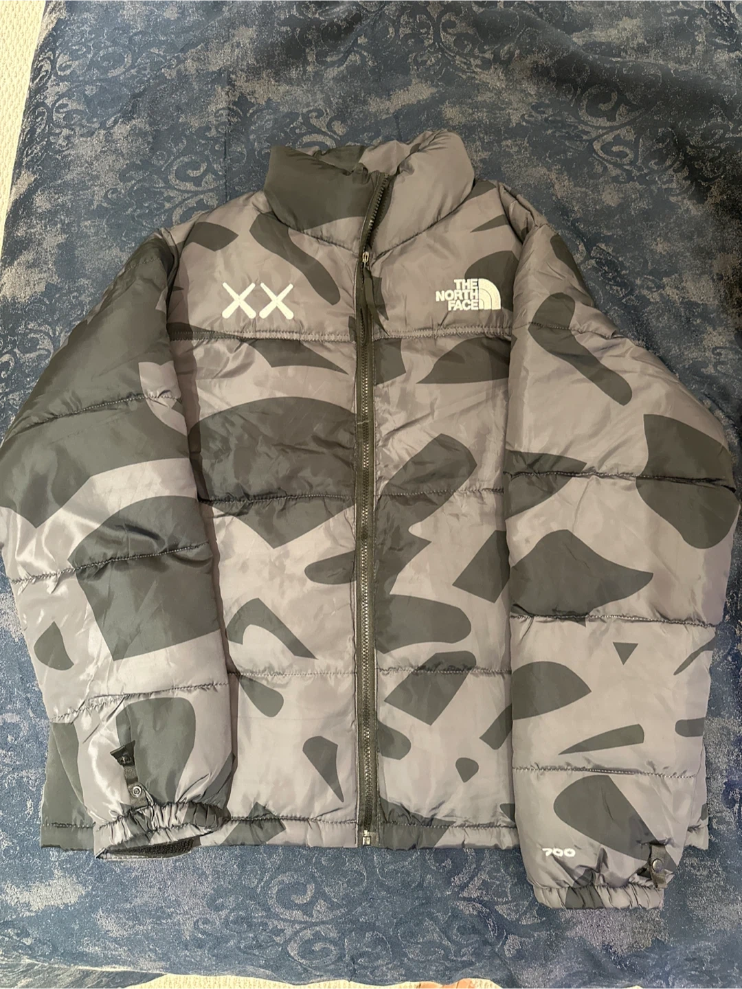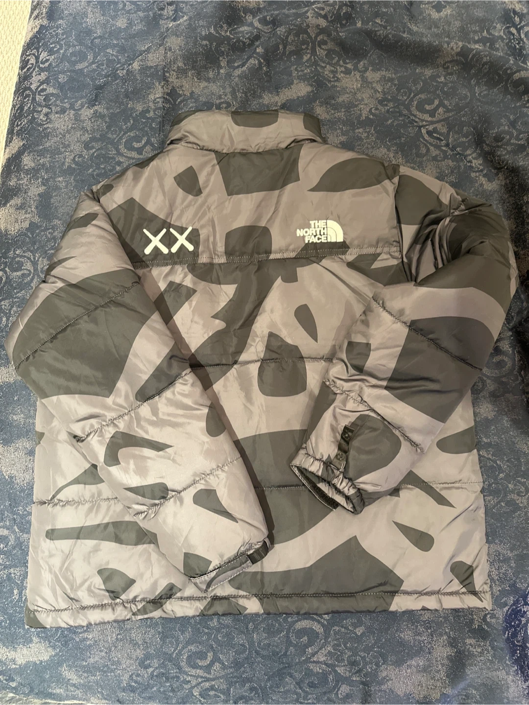 Selling a The North Face x Kaws puffer jacket in a cool grey camo pattern. It's a stylish and warm jacket, perfect for the colder months! Nxt 2 OG