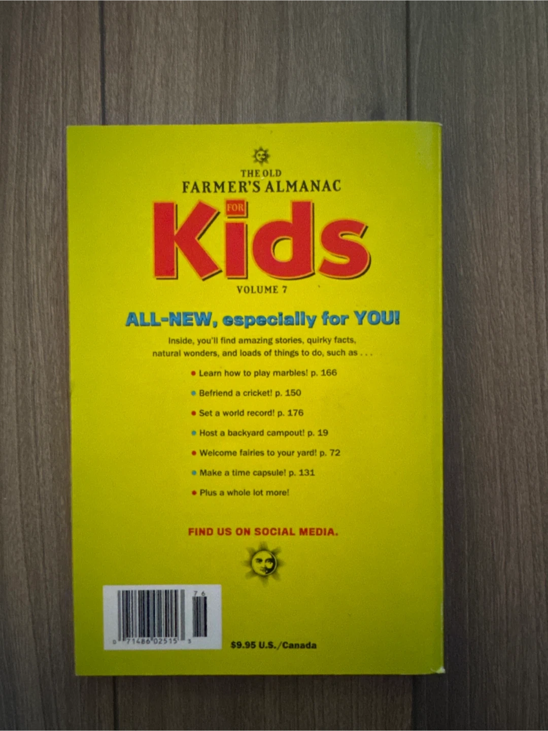 81Selling The Old Farmer's Almanac for Kids, Volume 7! It's filled with amazing stories, quirky facts, natural wonders, and loads of things to do, such as learning how to play marbles, befriending a cricket, and setting a world record!