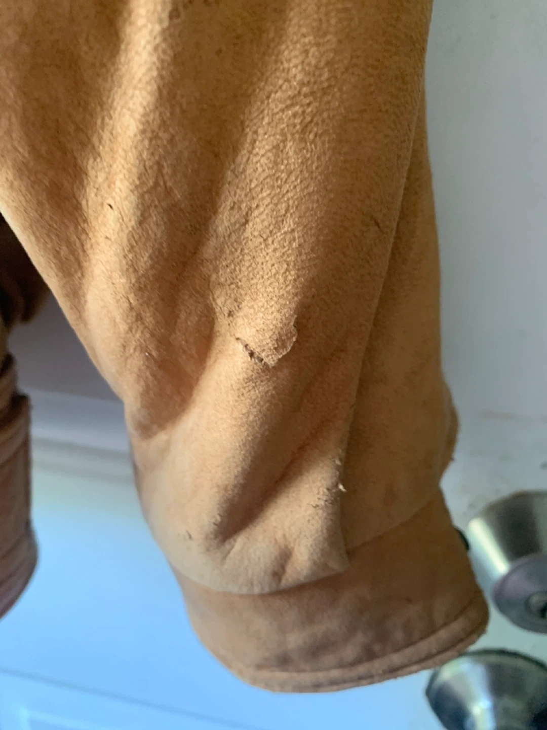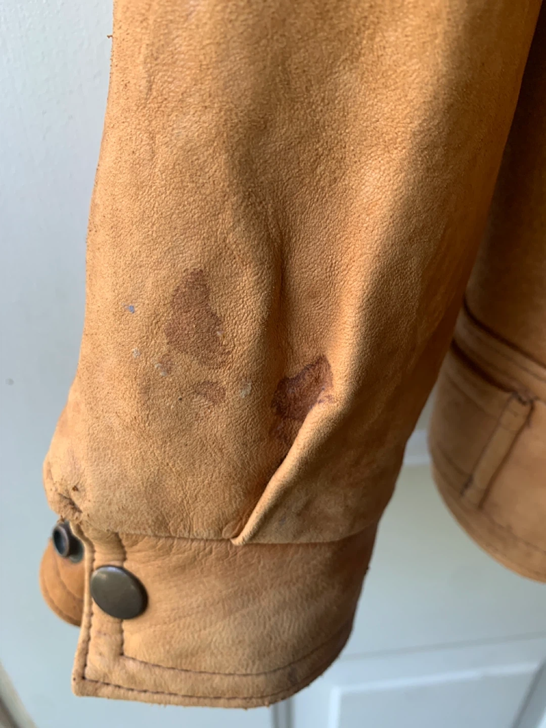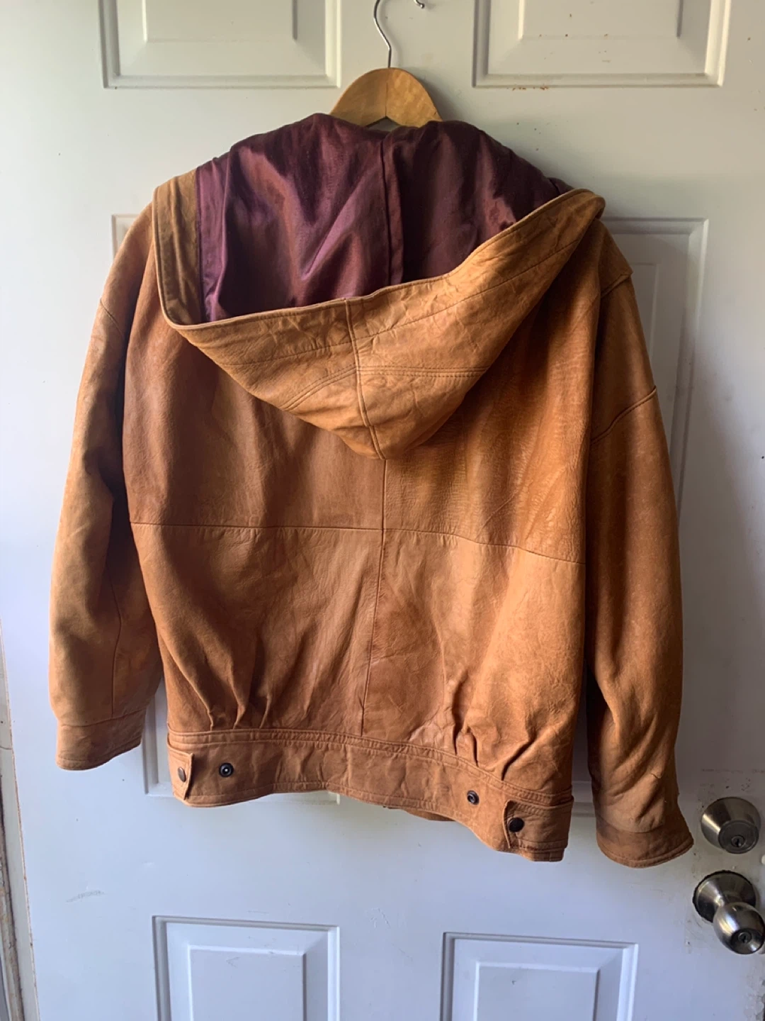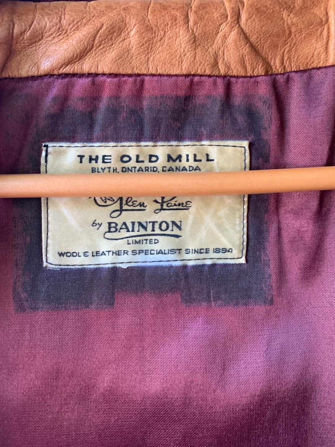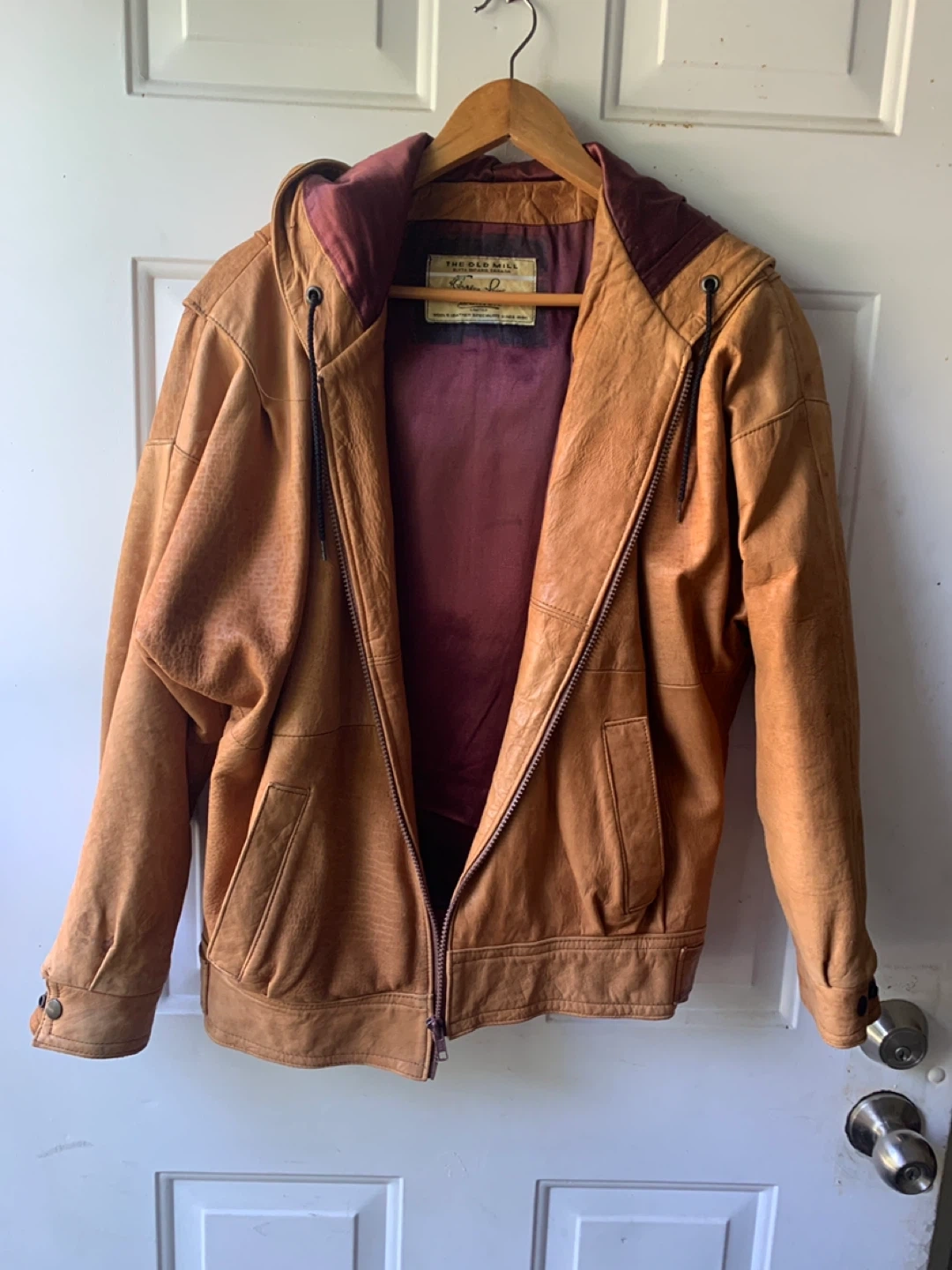 Selling a leather jacket from The Old Mill by Bainton. It's a Wool & Leather Specialist since 1894. The jacket has a hood. There are some signs of wear, including marks and peeling.