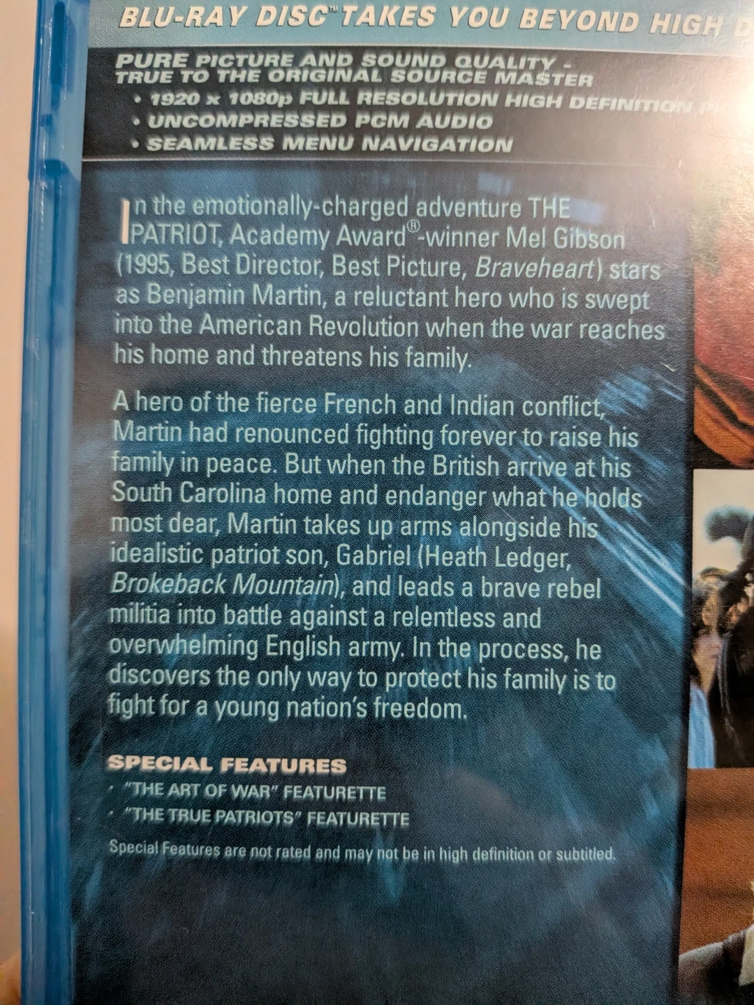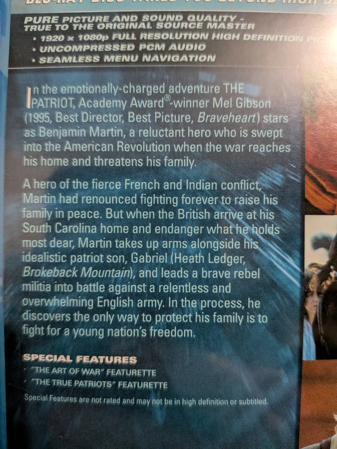 168Selling a Blu-ray copy of 'The Patriot' (Extended Cut) starring Mel Gibson. Enjoy this emotionally-charged Academy Award-winning movie in full 1080p high definition with uncompressed PCM audio. The Blu-ray also includes special features like 'The Art of War' featurette and 'The True Patriots' featurette! Mel Gibson, Heath Ledger No Scratches * Discounts for multiple item purchased Cash only, No etransfers Location: Etobicoke. Rathburn Rd and Renforth dr. Etobicoke Olympium nearby. 5 mins from Pearson Airport