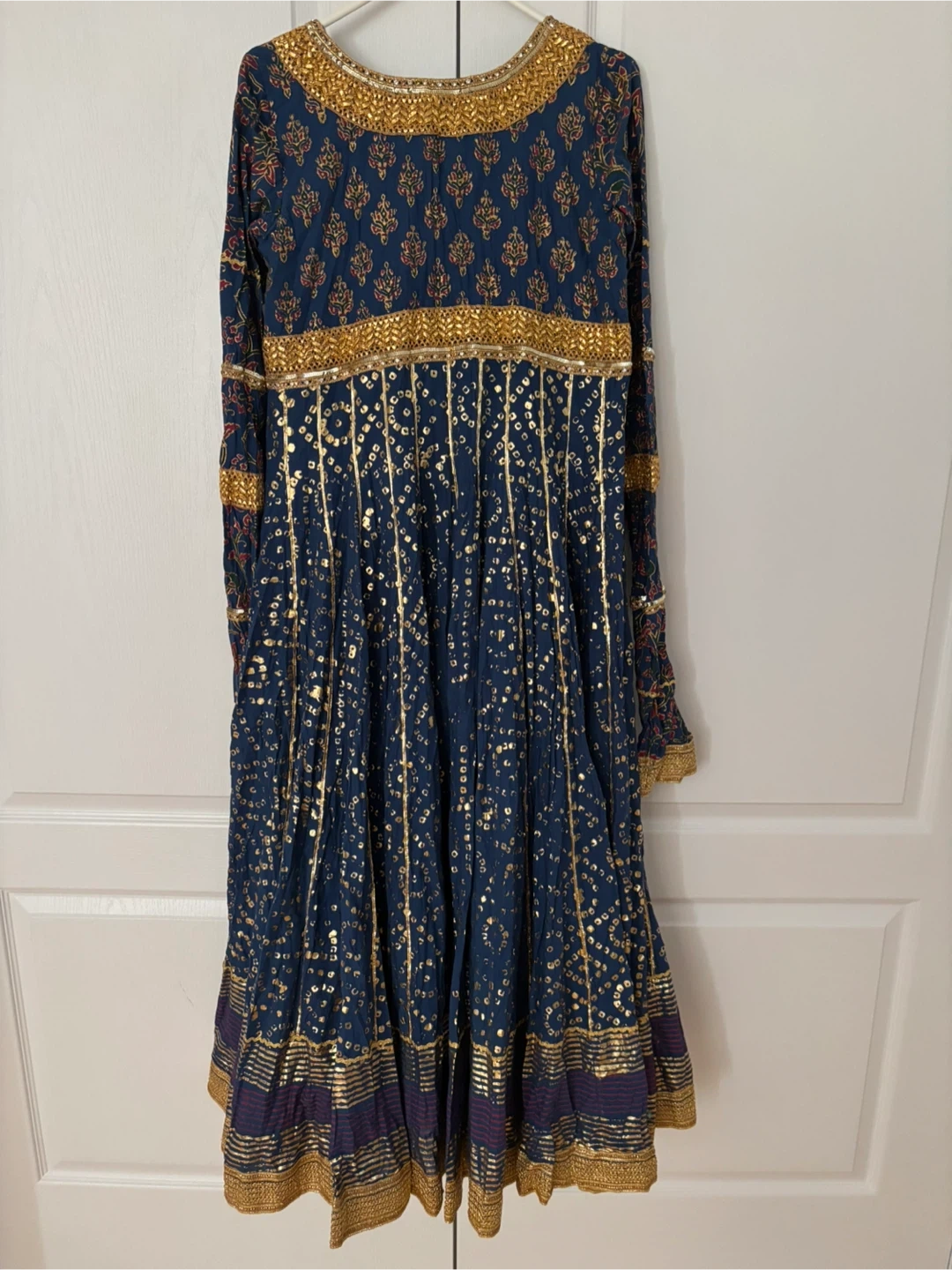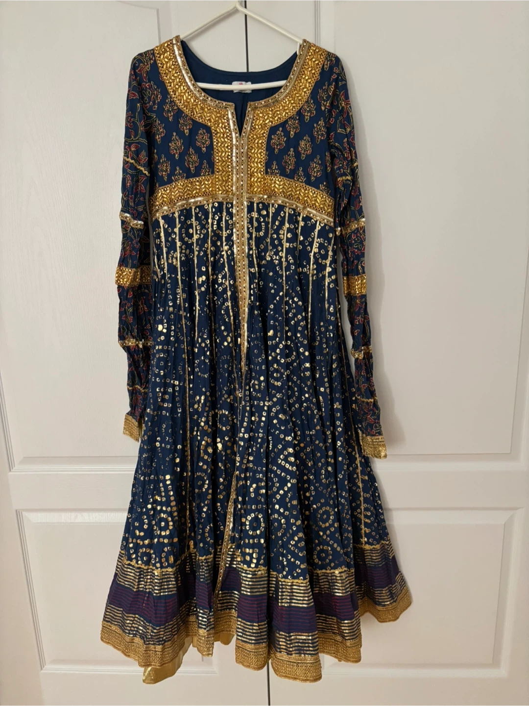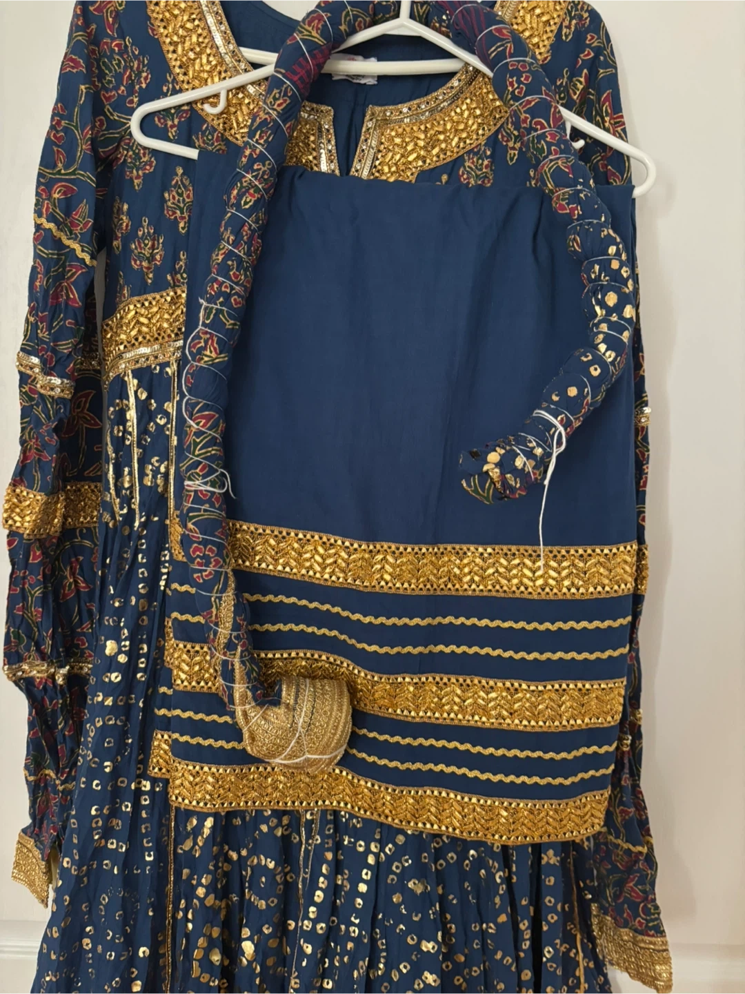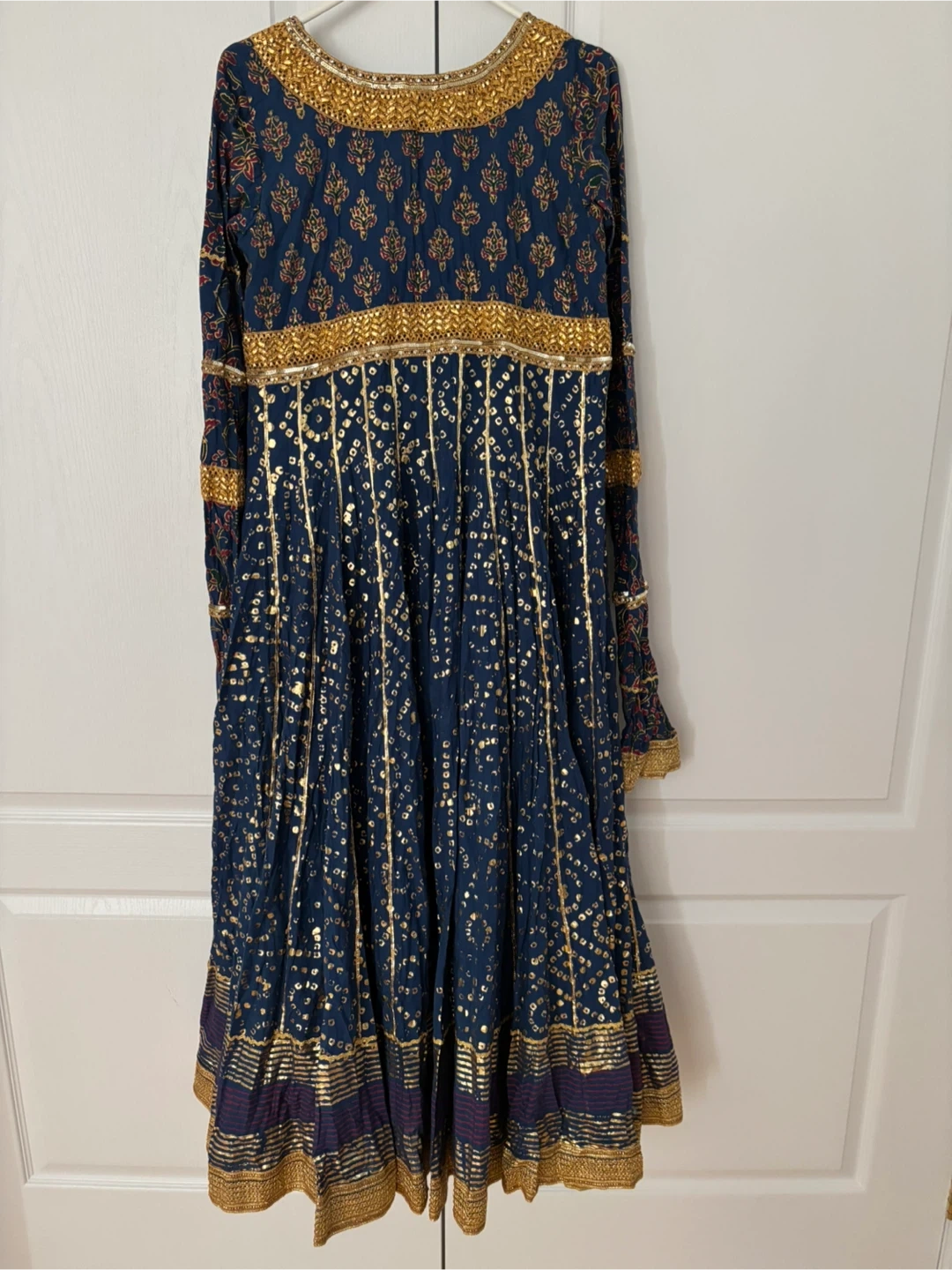 21Beautiful navy blue and gold Anarkali cotton dress with izaar pants and dupatta. The dress features intricate gold detailing and a flowy silhouette. Perfect for special occasions or festive events!